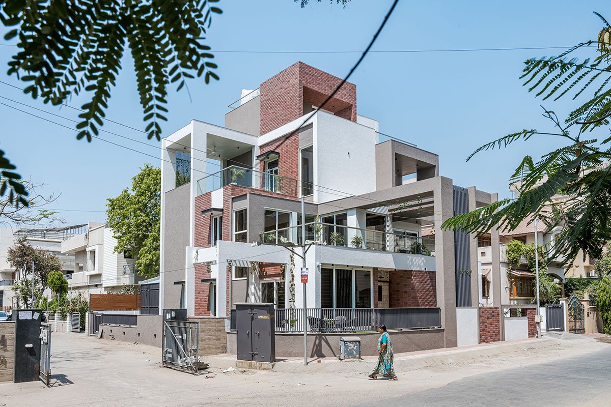[Text as submitted by architect] This 3900 sq.ft. east facing plot is located in the densely populated area of Paldi, Ahmedabad. Client has a requirement of a 4 BHK bungalow, along with garden space which permits interaction with nature. This house belongs to a family of 3 generations.