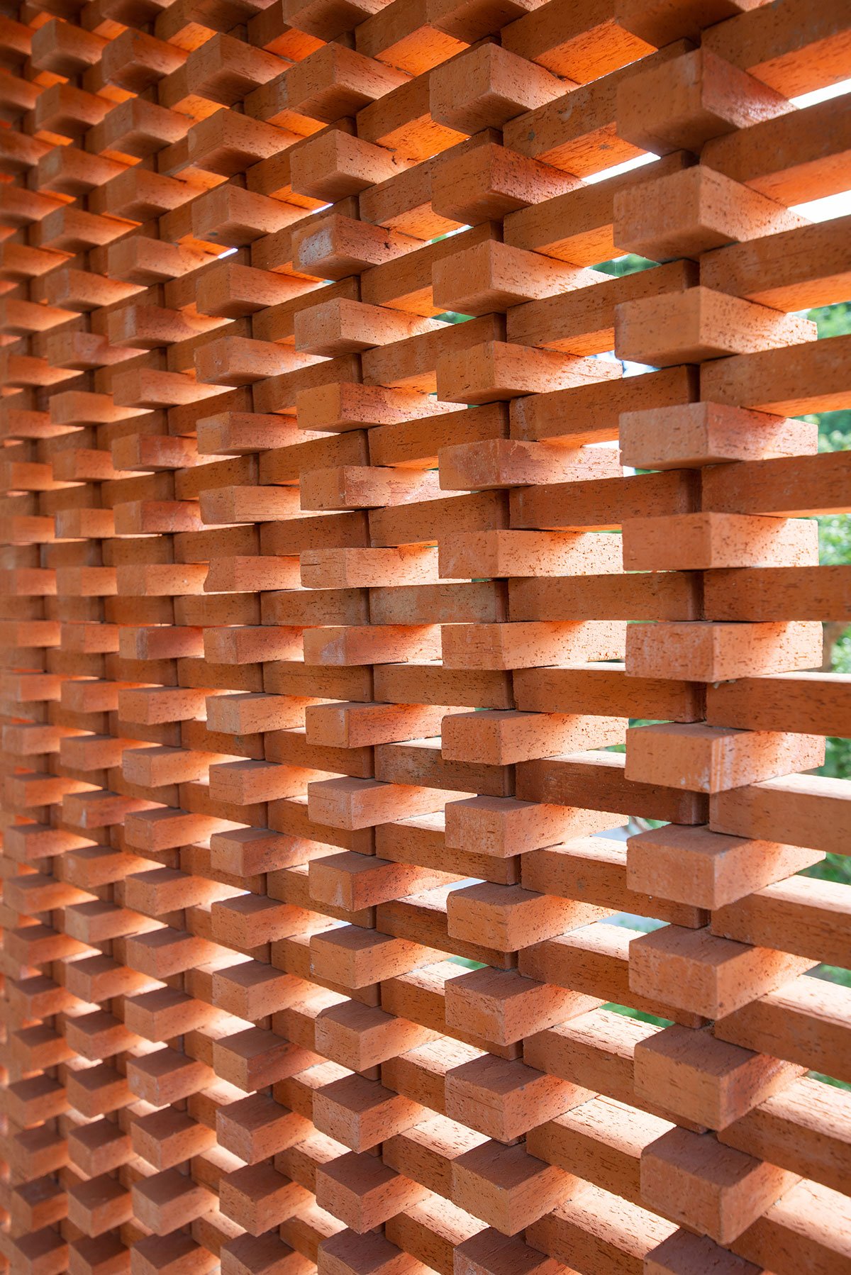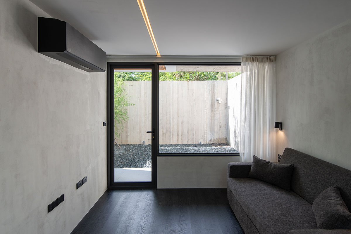 Inside the house, an architect designed a double space and an open plan for living, dining, and kitchen area. Consequently, this area can live all day without turning on the light and air conditioning, with the large opening on the north and west. The size is wide enough for natural light and suitable for the ventilated. There are brick-pattern facades on the western to screen the sunlight and heat that directs to the living room. In the guest bedroom, an opening on the northern connects to a private courtyard surrounded by a concrete wood texture fence. It has clear transparent roofing for the bathroom. The downstairs materials are natural brick, wood, black vinyl wood flooring, and raw concrete textures from structural work.