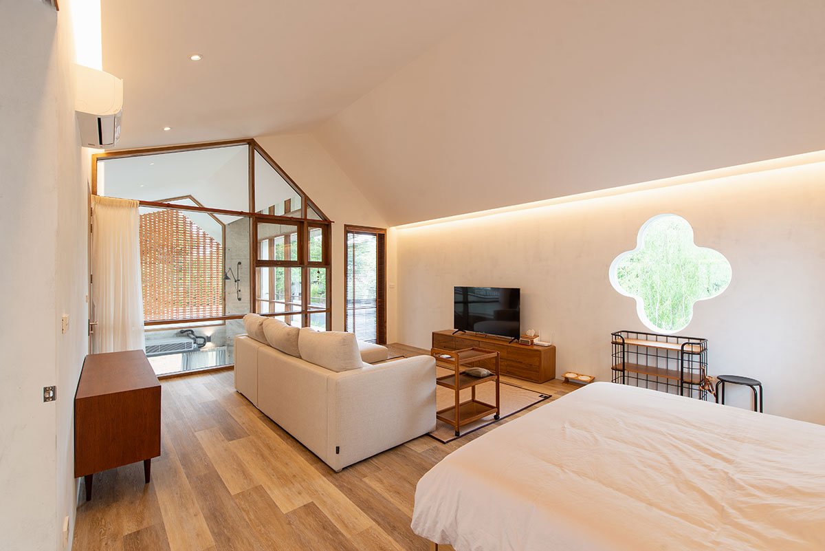 On the 1st floor, there is only one main bedroom. The concept of the materials is from Miss. Suwadee. She loves cleanliness and a cozy look. Therefore, the materials in this area are wood with a white skim coat wall. Moreover, the architect used the sloped ceiling to create a more open and comfortable space. There is a large window on the western so the owner can notice activity in the living area while they are living upstairs. On the northern wall is an opening in a cloverleaf window shape (Tha-wi-pob), which an owner requested, and a balcony opens directly to the landscape. About the main bathroom, they asked for a large and well-lit one. Thus, the architect designs the white wall partition to reflect the light through the bathroom. The partition also increases the privacy of the main bathroom.