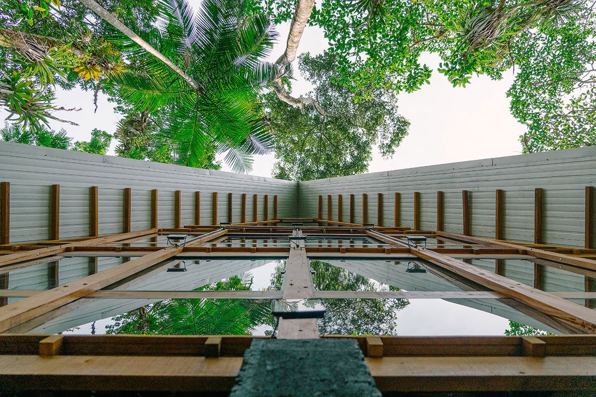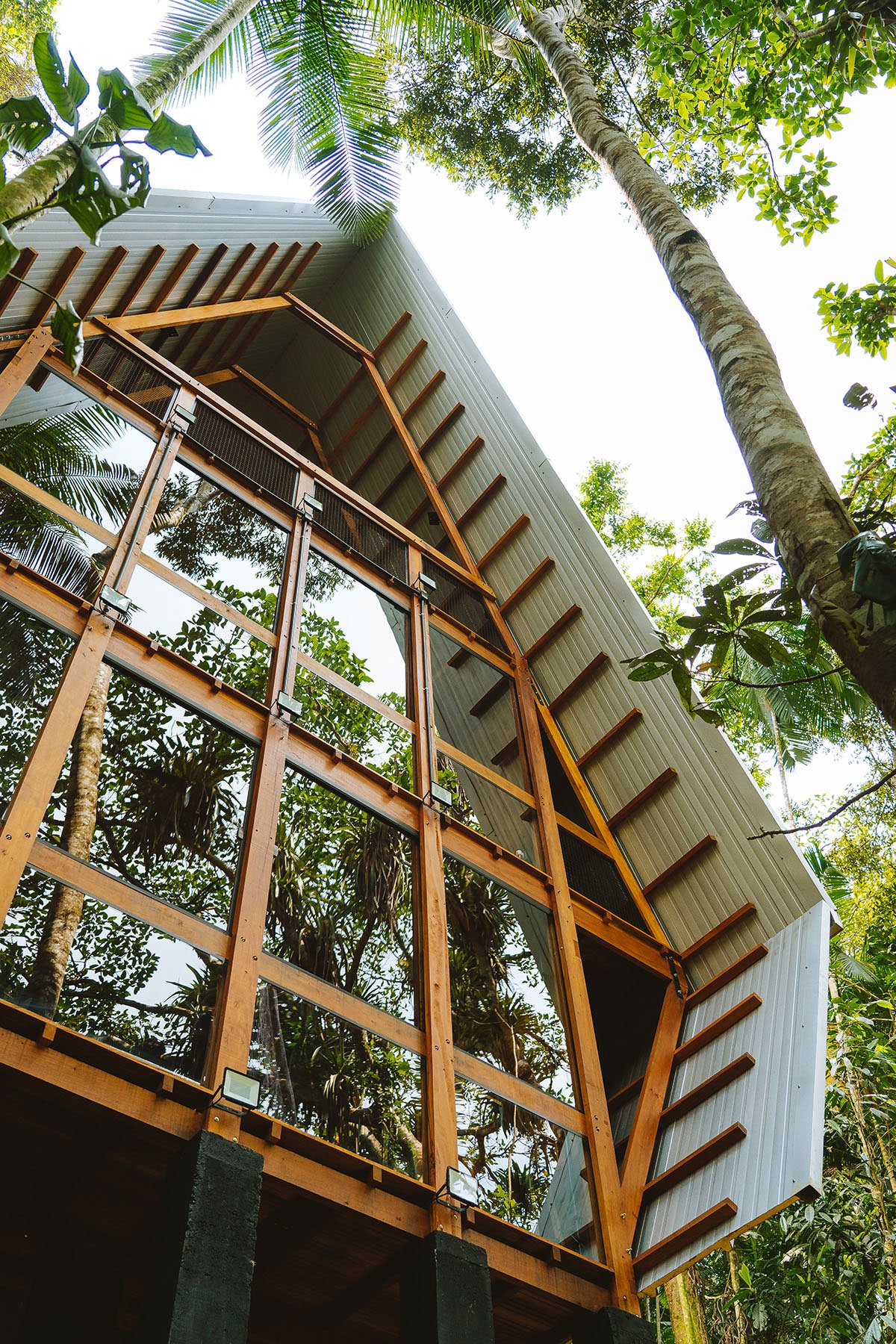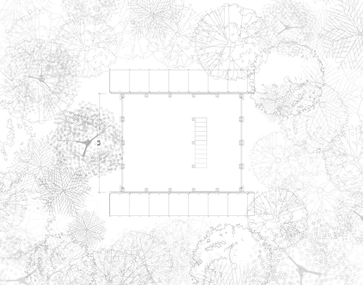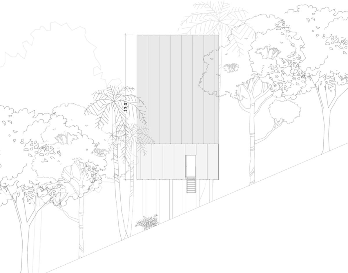 The best design solutions already exist in Nature. For 3.8 billion years, life creates elegant solutions in intelligence and simplicity. In order to design the support structure of the Monkey House, we were observing which plants were better adapted to the topography of the land and which strategies were adopted to allow stability in height growth. The juçara or içara (Euterpe edulis) in Tupi, is an endemic palm of the Atlantic Forest which is structured through props roots, adapting itself to the downhill terrain and distributing the dynamic weight on multiple vectors ensuring stability for the thin and very tall stalk.