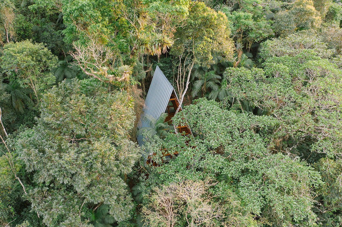 Excerpt: Monkey House, designed by Atelier Marko Brajovic, is a cabin with solutions taken from nature that portray intelligence and simplicity. Plants were studied according to the topography to derive strategies for height growth stability. As well, conducting local plants’ growth around the house proposes a state of immersion of the house and the humans into the wild. The top floor of Casa Macaco is an observatory. A place of encounter and reunion, to observe Nature outside and inside us, to learn and relate regeneratively.