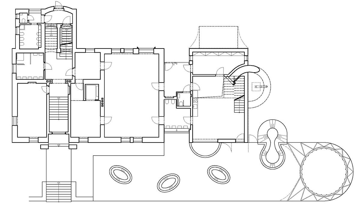 We pictured how fun it would be to run around between the old and the new part of the building through the bathrooms. We wanted to make it possible to climb out of the extension onto a large concrete terrace, where the children are safe and at the same time have as much freedom as possible. We put another play terrace on the roof because the view from the roof is beautiful. We connected the floors inside the kindergarten with a slide, which the children use to leave the building for a moment without asking and then return to it giggling. The interior space is in fact one large room split vertically into four levels. The children can always see each other, but they can also hide in a number of places if they want privacy for their mischief.