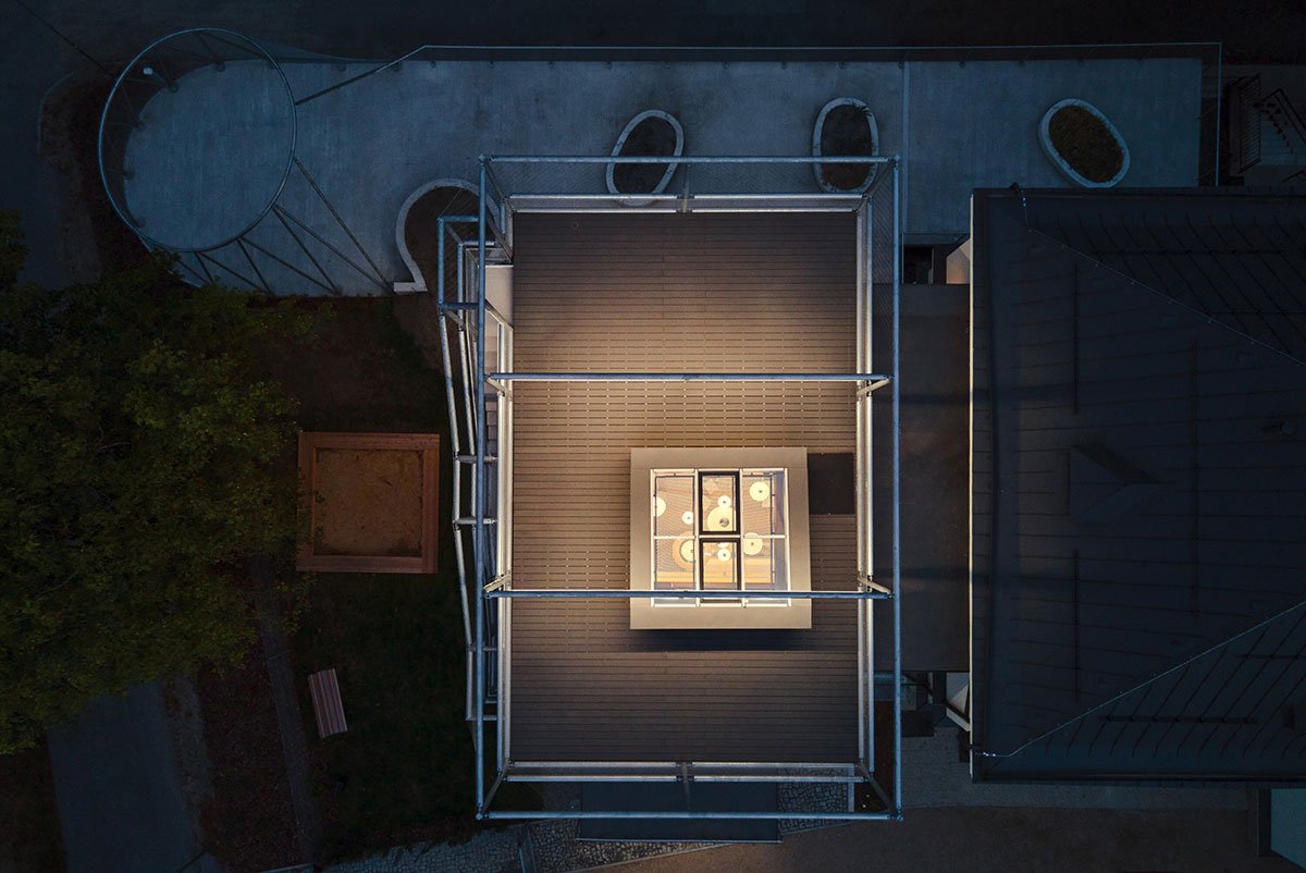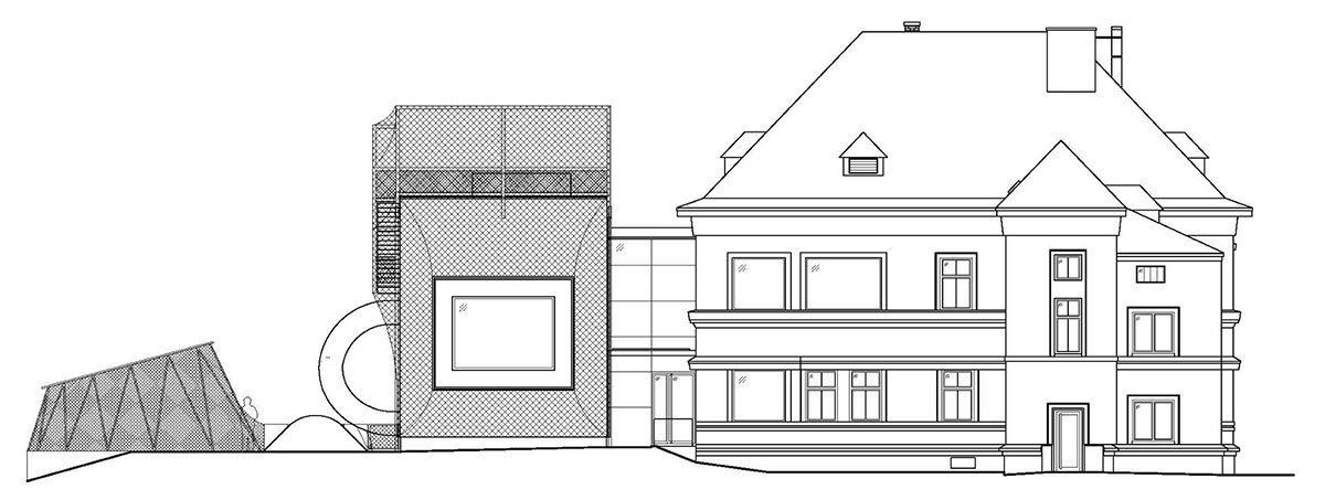 The extension of the Montessori Kindergarten in Jablonec nad Nisou is a two-story building made of reinforced concrete. It stands next to a historic kindergarten building and its form and material contrasts with this larger building. It is a simple prism with a few protrusions, which is wrapped entirely in stainless steel mesh. Inside, the building is vertically divided into a ground floor and three intermediary floors arranged around a staircase and a void, above which is a large skylight in the roof. On the intermediate floors, there are spaces for children to spend time, each intermediate floor has a different atmosphere and form to stimulate the children’s minds in a different way.