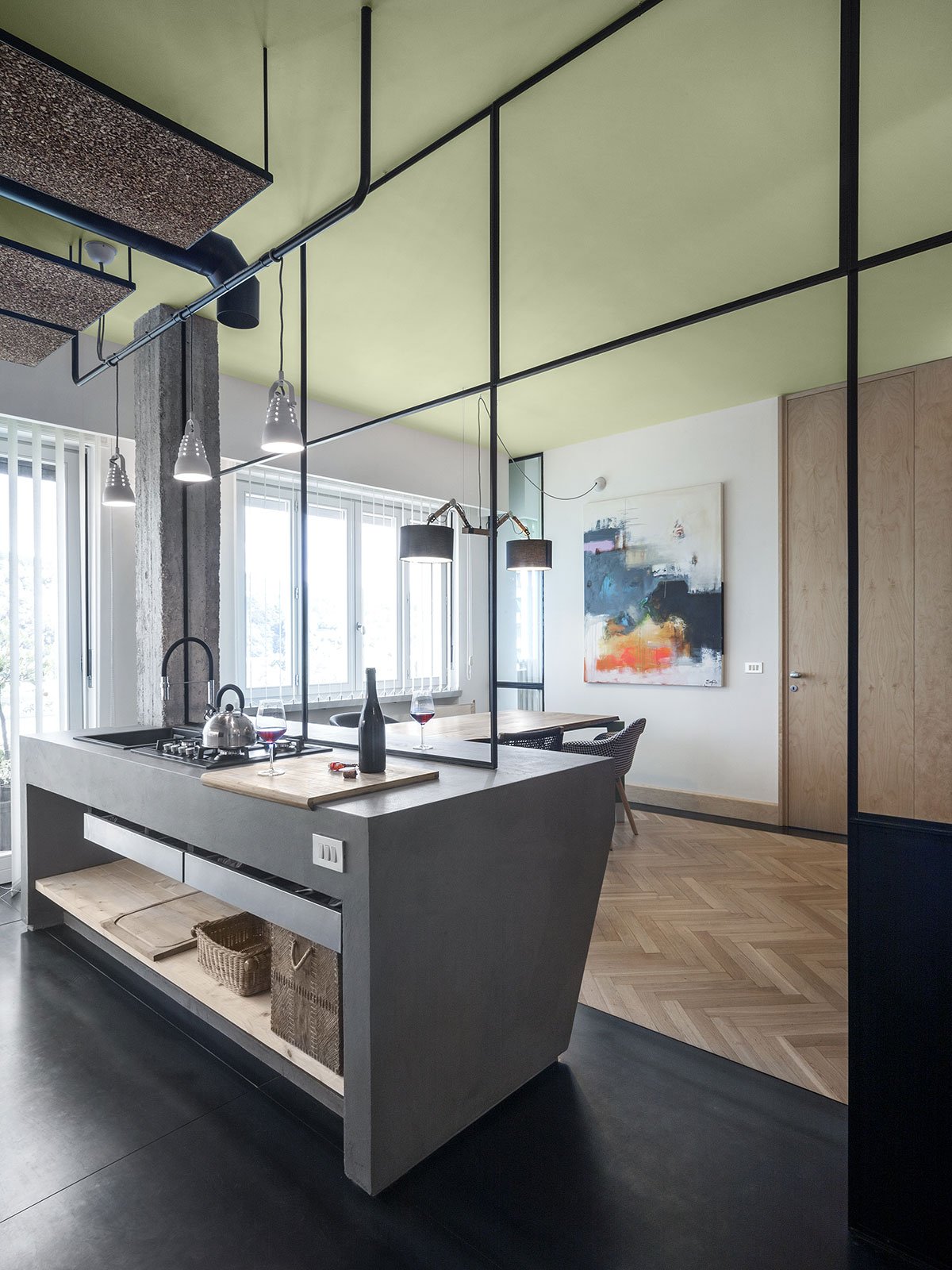 [Text as submitted by Architect] This intervention is part of our double project in the same building. They have the same starting plan. They are two twin residential units, respectively the 5th and 6th floor of the same building. Even the internal conditions were the same. Operatively we oppositely faced this project. The approach to the two projects was somewhat antithetical. Despite having a similar client, a young couple, we decided to treat the distribution issue differently.