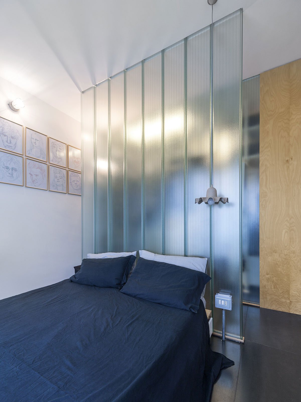 The space division is left to a wall made of U-GLASS, a structural glass used in industry, which allows the light to penetrate where another material would not have allowed.