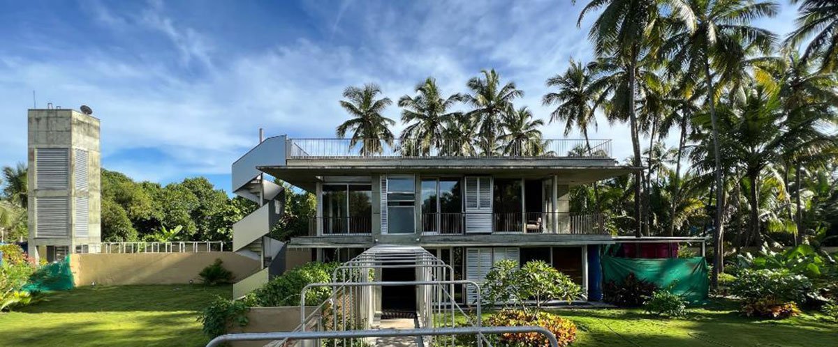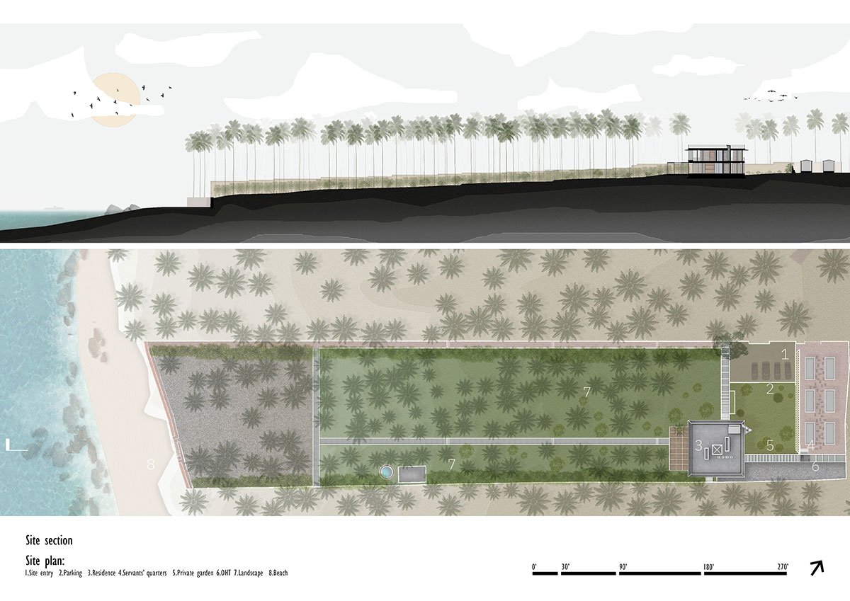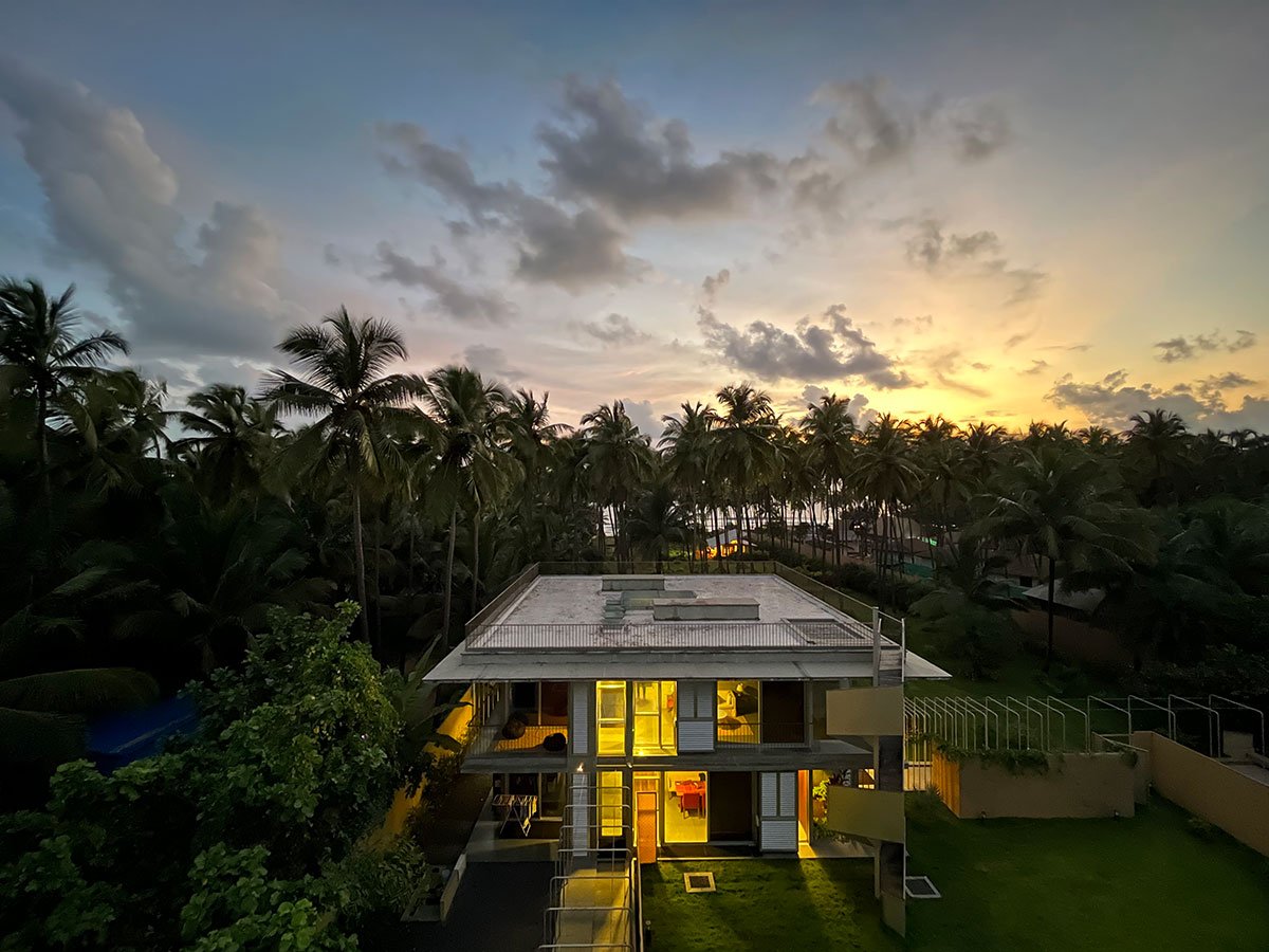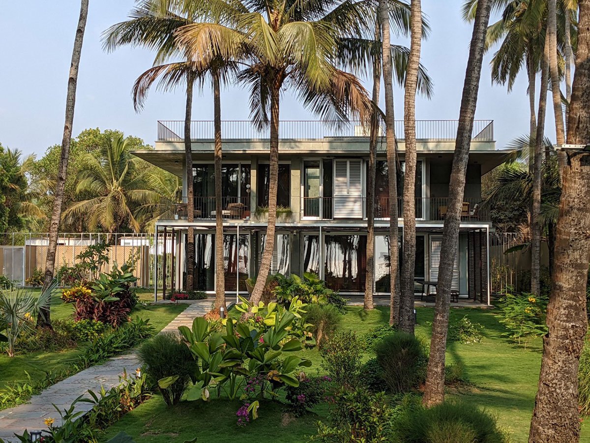 [Text as submitted by architect] The site of about two acres is linear in nature abutting the sea, located along Morjim beach in the north of Goa. The house is set in the deep end of the property towards the east and slopes down by almost 6 meters towards the beach.