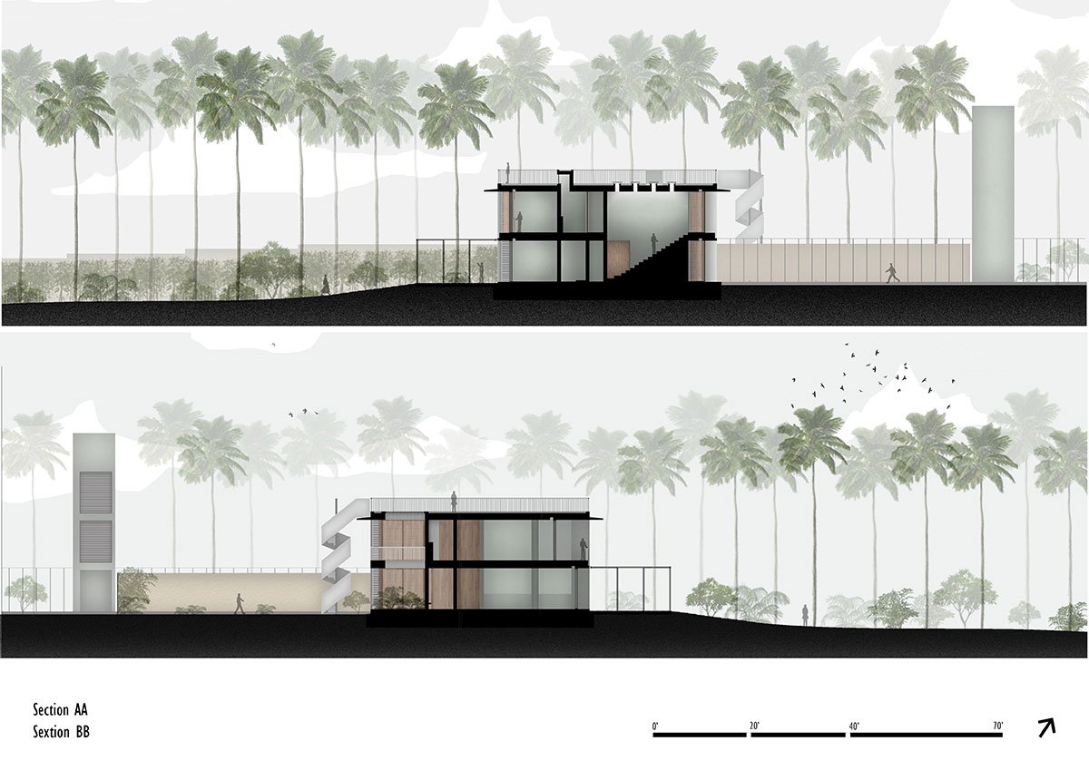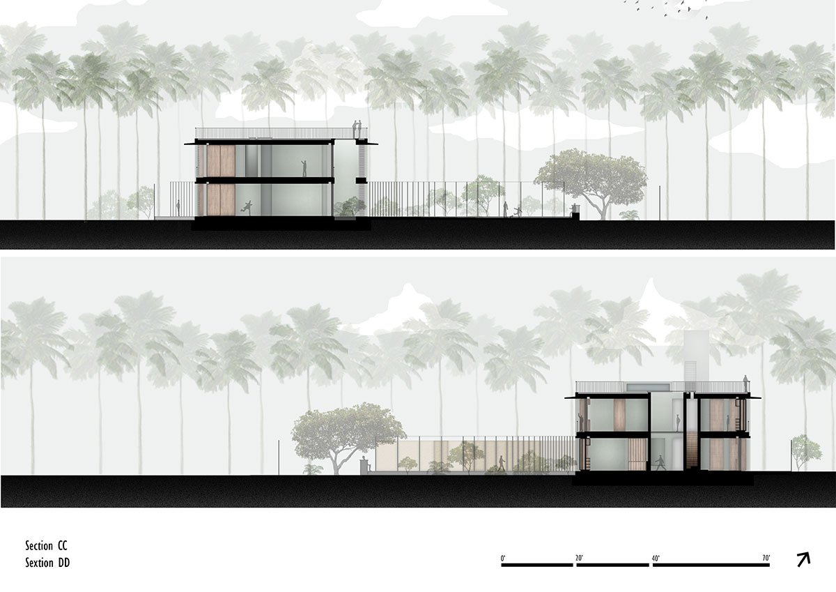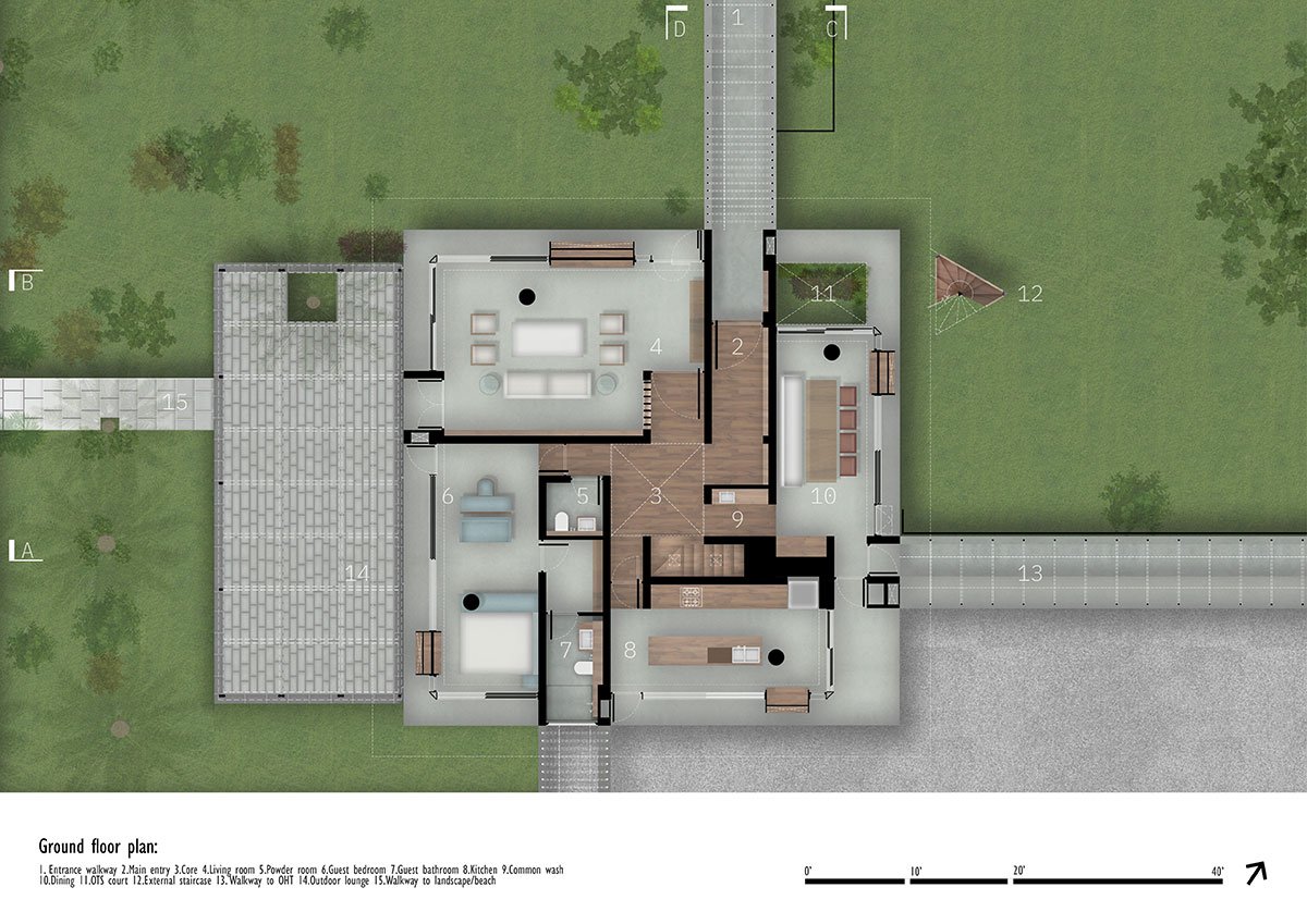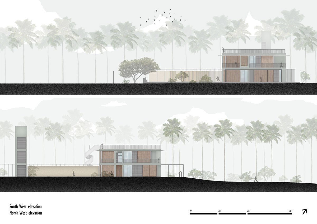 [Text as submitted by architect] The site of about two acres is linear in nature abutting the sea, located along Morjim beach in the north of Goa. The house is set in the deep end of the property towards the east and slopes down by almost 6 meters towards the beach.