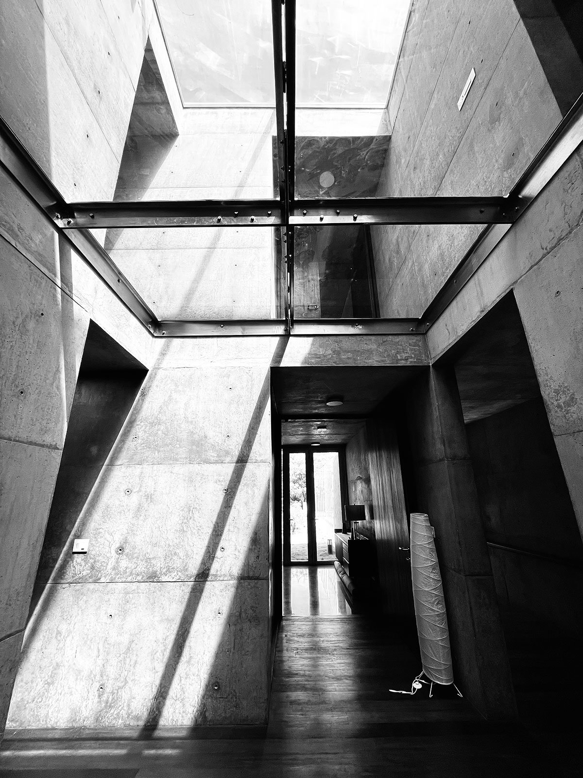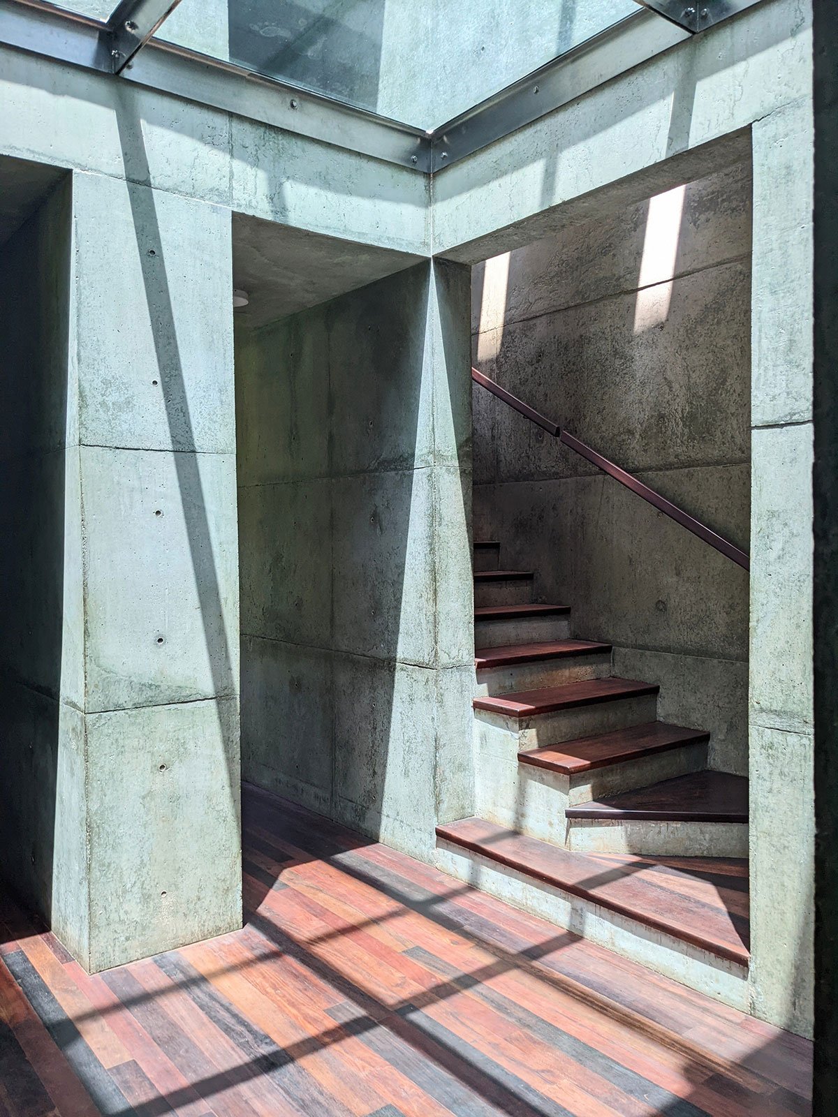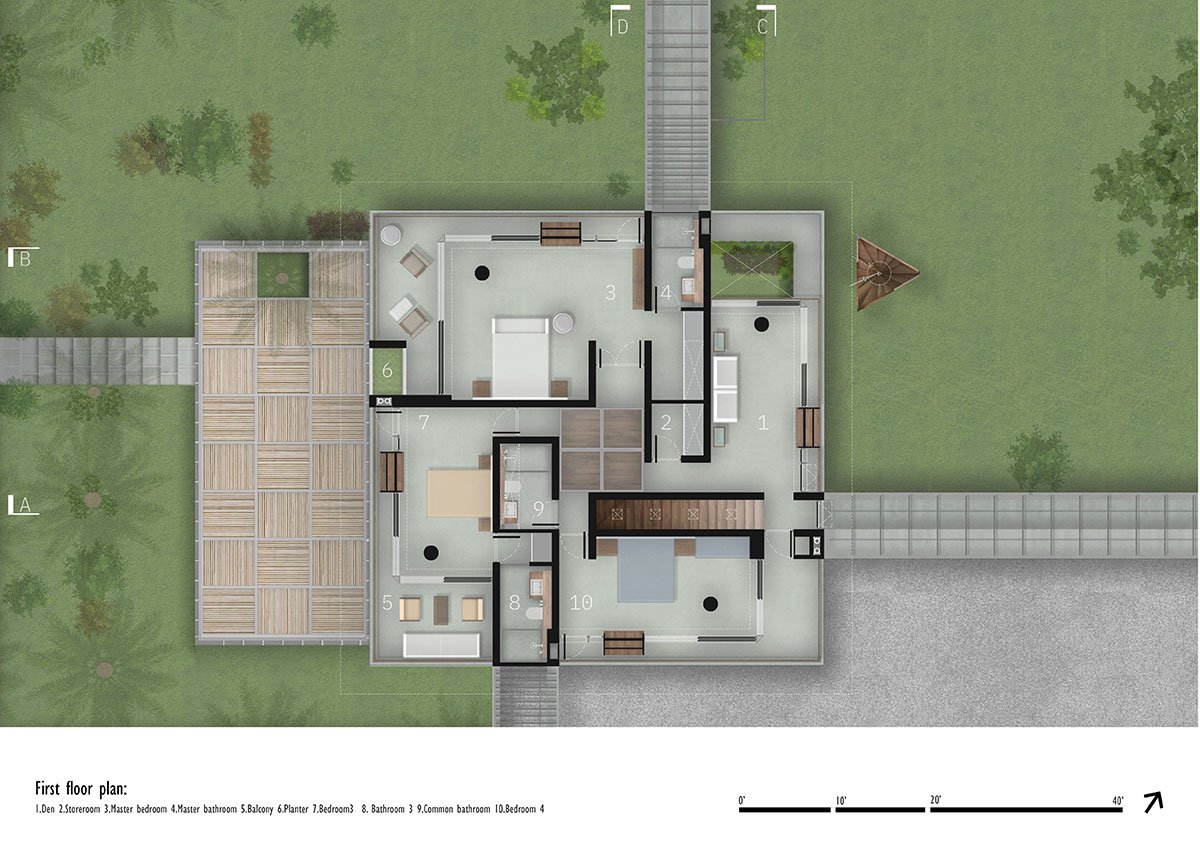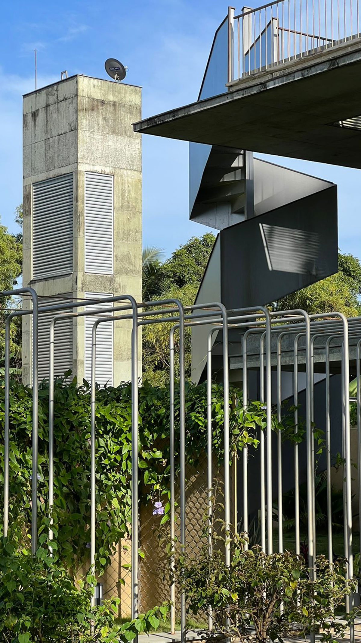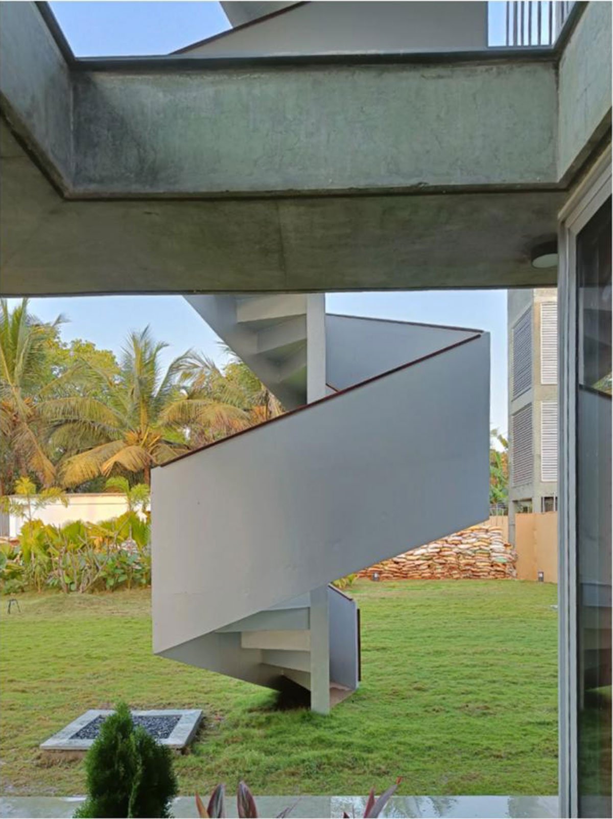 The design was conceived as a four-armed pinwheel representing the dynamic circular motion that abstractly refers to the movement of the heavenly bodies, four elements of nature namely fire earth water, and air, and cardinal directions viz east west north, and south. Even though it appears anchored to the land, the larger context is constantly changing. By default, the four-armed pinwheel configuration gives rise to four quadrants that end up becoming various spaces with the axis of the pinwheel housing the services. The corners are set free of the walls.
