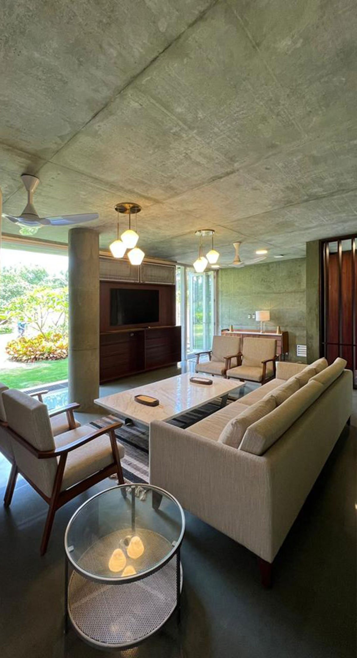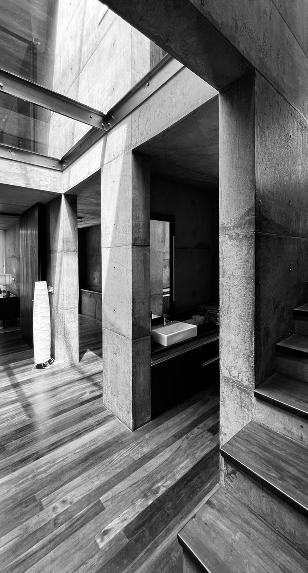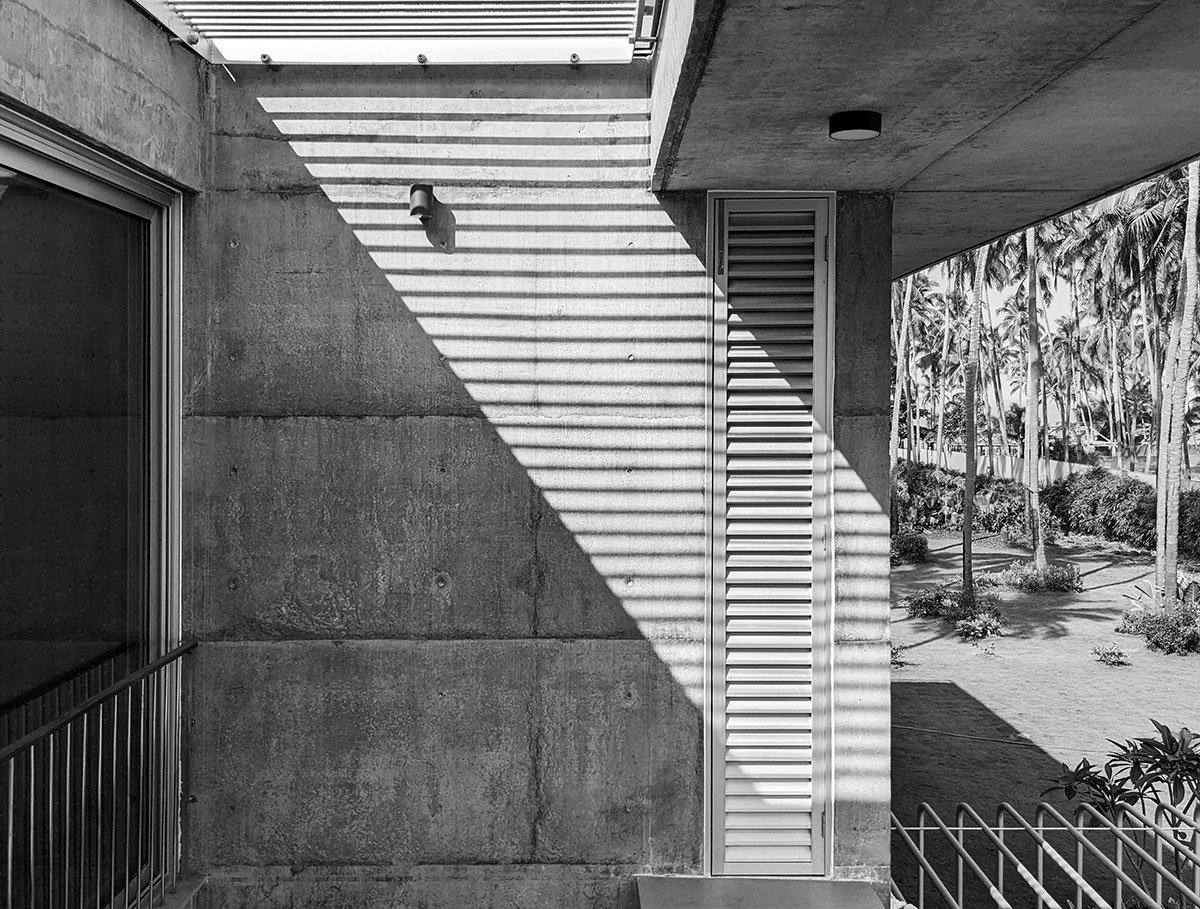 Even as the entire design appears to be symmetrical, the spaces and the proportions of the openings have been tweaked to address the respective surroundings that they open out to. The west facade flows into a deep landscape that emerges with the sea. The northern end faces the entrance and the eastern edge has an enclosed courtyard.