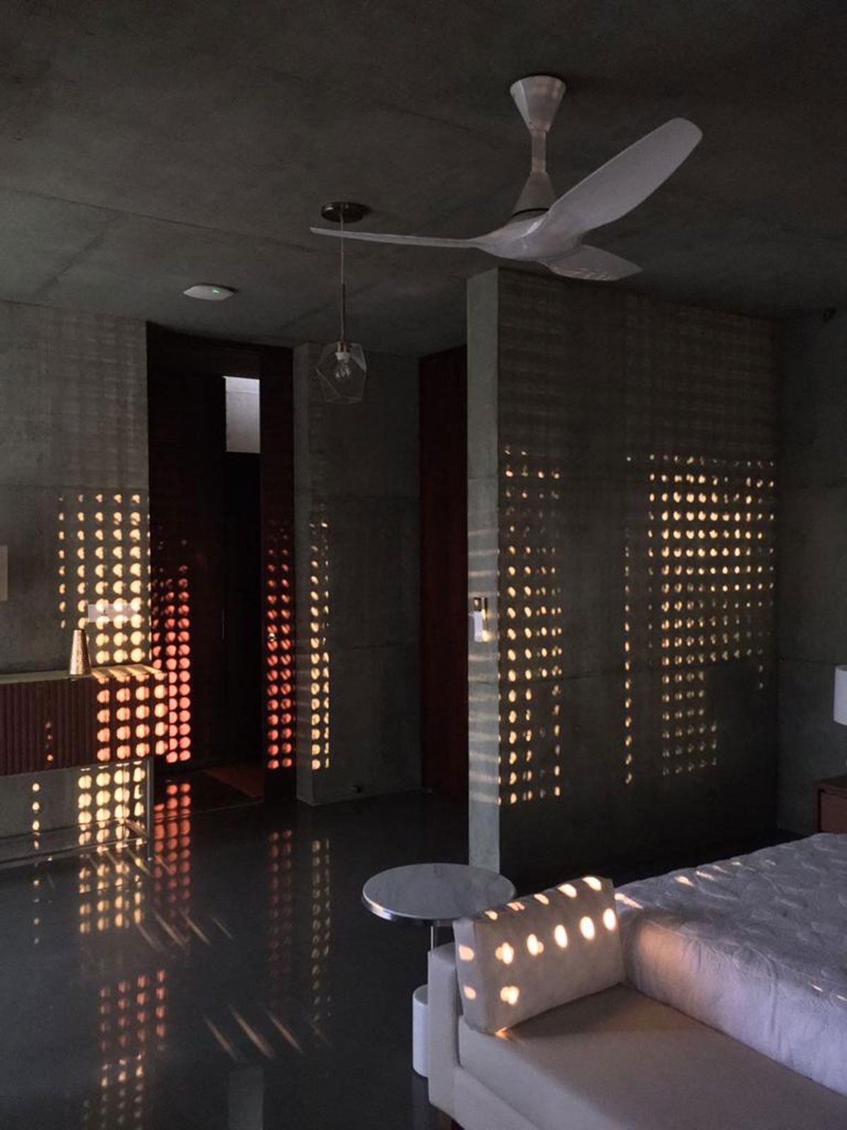The choice of using mildly green tinted form finish concrete and aluminum was primarily made from a fundamental concern of maintenance, durability, and ease of construction on site abiding by a restricted time schedule. The flooring is that of Kota stone. The external doors are made of double aluminum sliding shutters consisting of an external layer of glass and the second layer of perforated wooden panels.