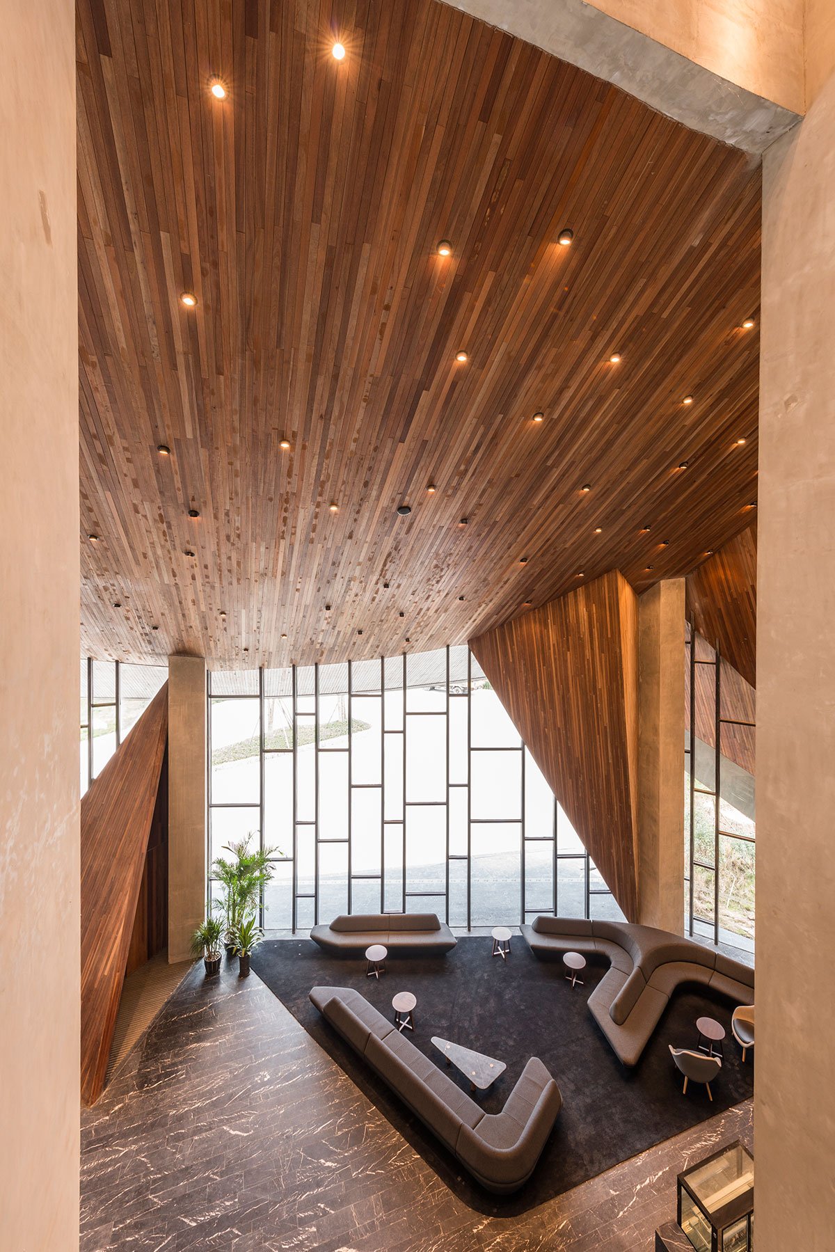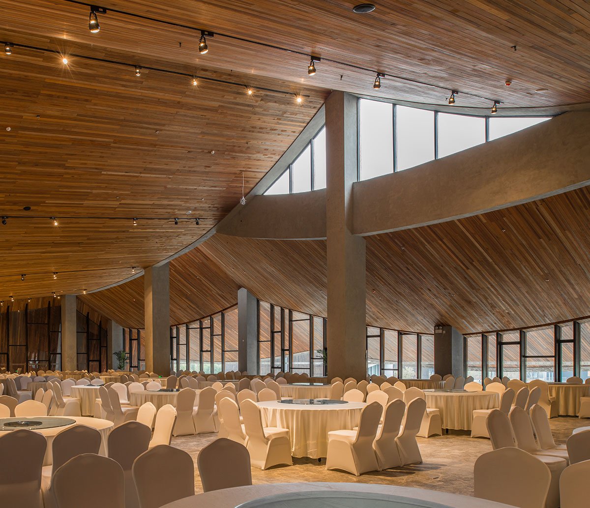 Excerpt: Muweco, a hospitality project by AIM Architecture, is a multi-functional structure that houses a wedding hall, a small museum, and a conference space on the grounds of Fushengyu Hot Springs Resort. A vaulted roof, pressed cork, and warm timber all evoke the natural surroundings without feeling redundant. The structure is striking against the natural landscape and evokes the feeling of being under a big tent rather than inside a large building.