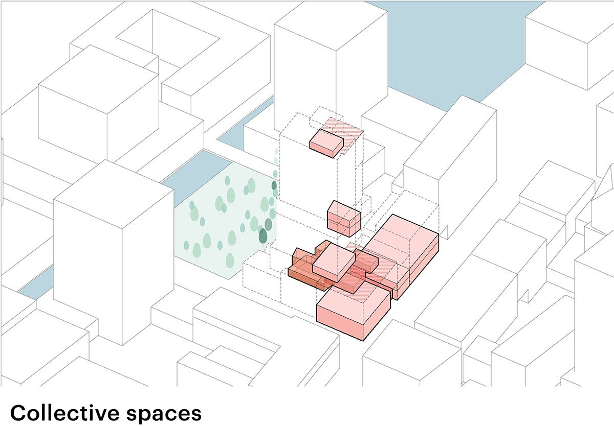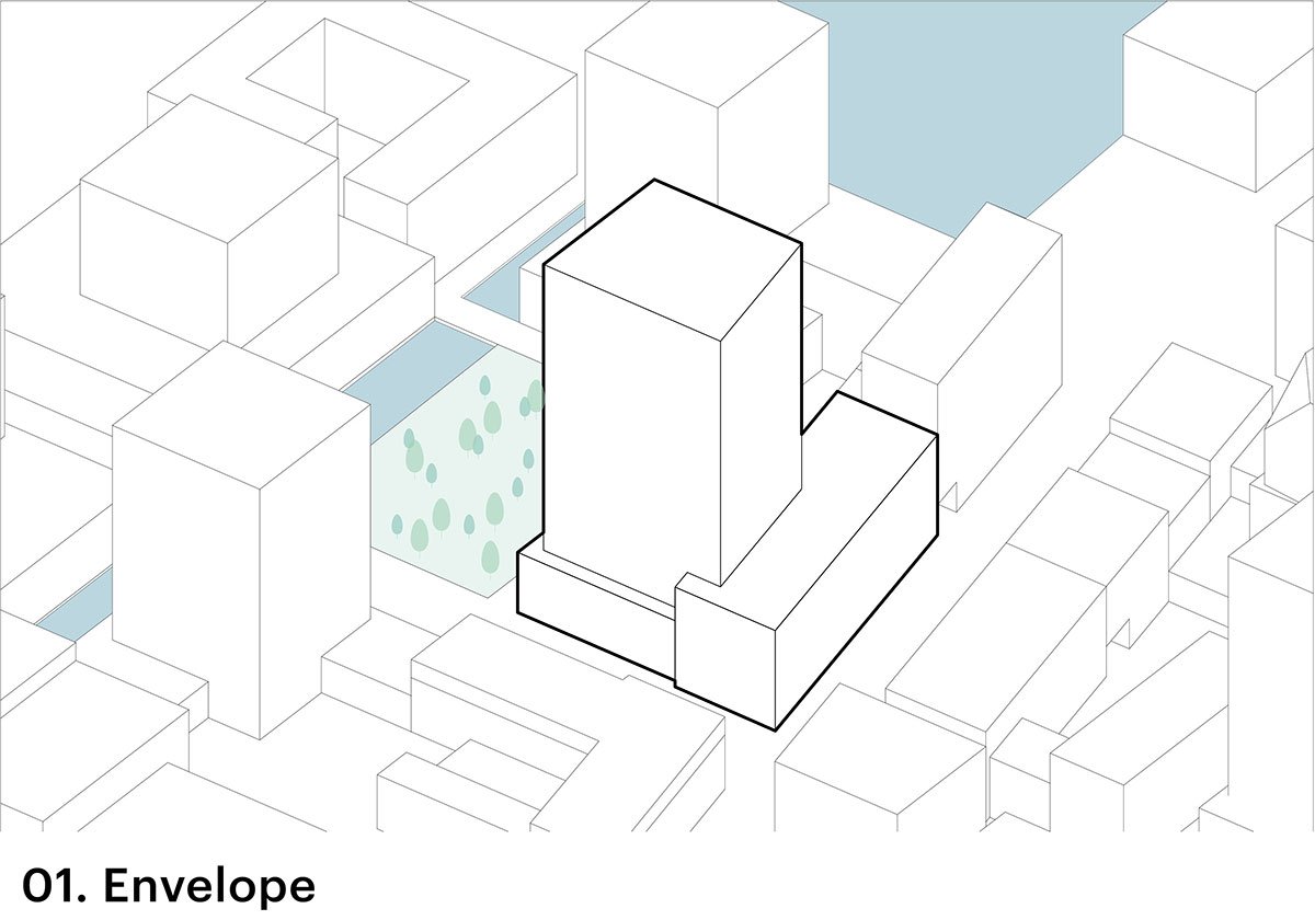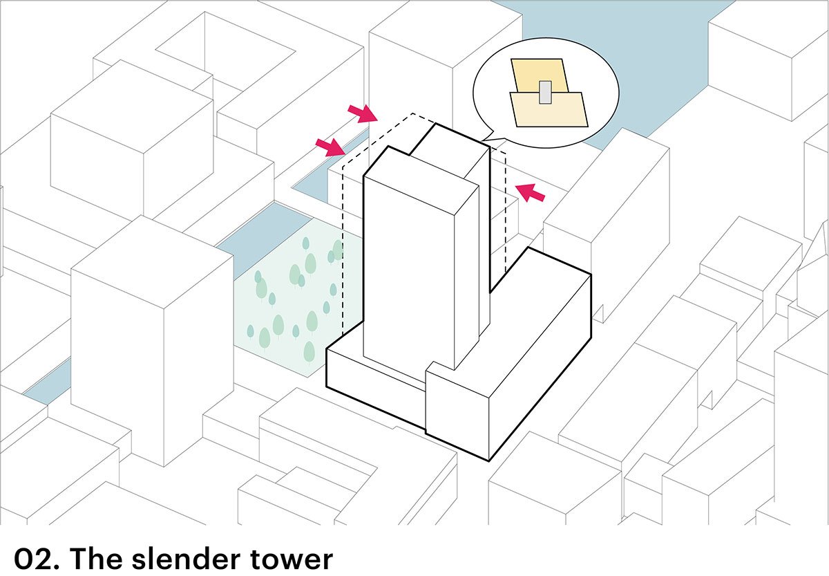 The tower rises to 70 metres, built up of blocks that gradually increase in size towards the top of the tower. with varying facades and outdoor spaces to underline the diversity of apartments within. With the lower half containing the project’s mid-sector rental properties, offering excellent access to the communal rooftop spaces which top the plinth.