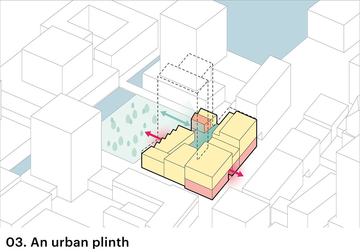 Along Rudi van Dantzigstraat, the plinth is constructed out of blocks of three to six storeys, echoing the sizes of neighbouring buildings and hosting a series of double-height spaces for shops and cafés. On the side of the pocket park, the plinth is broken up even further to create a series of townhouses, which are punctuated in the middle by a communal greenhouse and a broad green staircase that extends the greenery upwards to a first-floor courtyard in the heart of the plot.