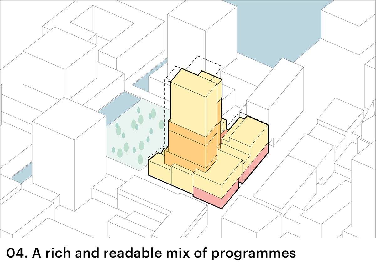 Located at the heart of the Sluisbuurt, between Rudi van Dantzigstraat and a small pocket of greenery, the project’s diverse range of apartments and retail is expressed in its visual appearance: the shape of the building is composed of a series of blocks which act as like a collection of different neighbourhoods. These blocks are positioned side-by-side at ground level to form the plinth, and vertically to form the tower above.