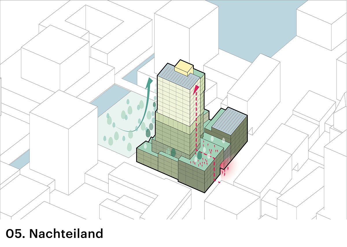 Officially called Nachteiland – meaning “night island” in Dutch, in reference to the work of choreographer Rudi van Dantzig after whom the neighbourhood’s main street is named – the building is designed for the real estate partnership of LOCUS Real Estate Development and Miss Clark.