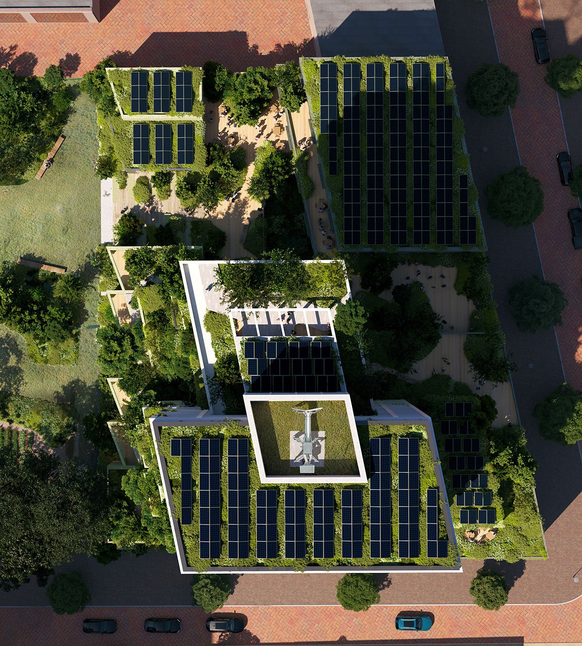 Many of these rooftops feature pergolas supporting solar panels, allowing accessible spaces where relaxation coexists with energy generation. The façade of the tower features a different type of solar panel, using building-integrated photovoltaics (BIPVs) that combine solar energy generation with a tasteful green finish.