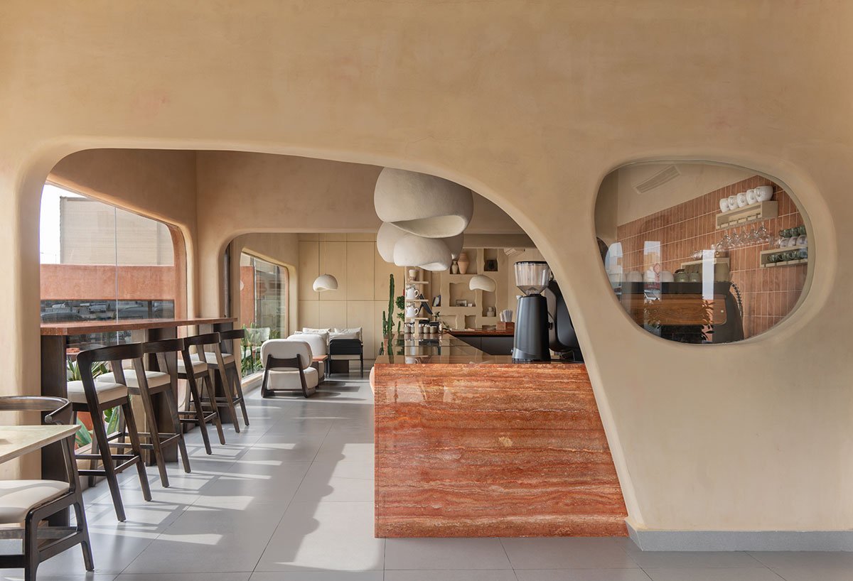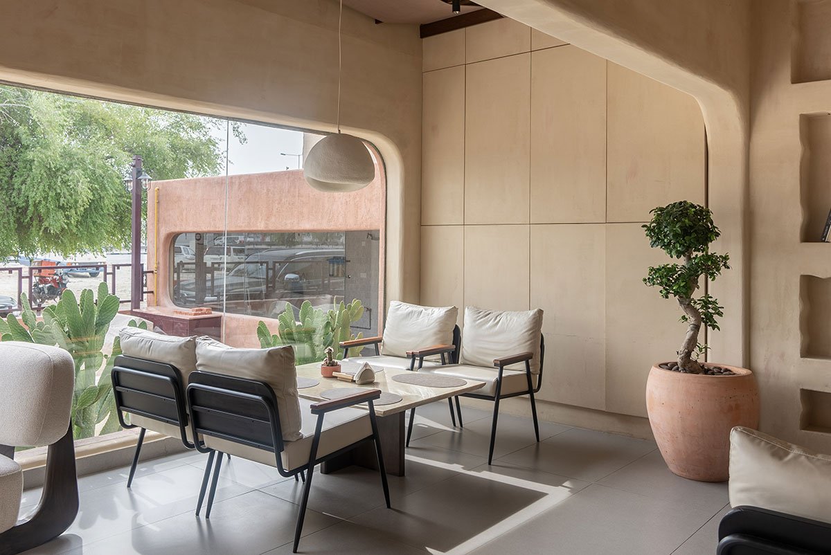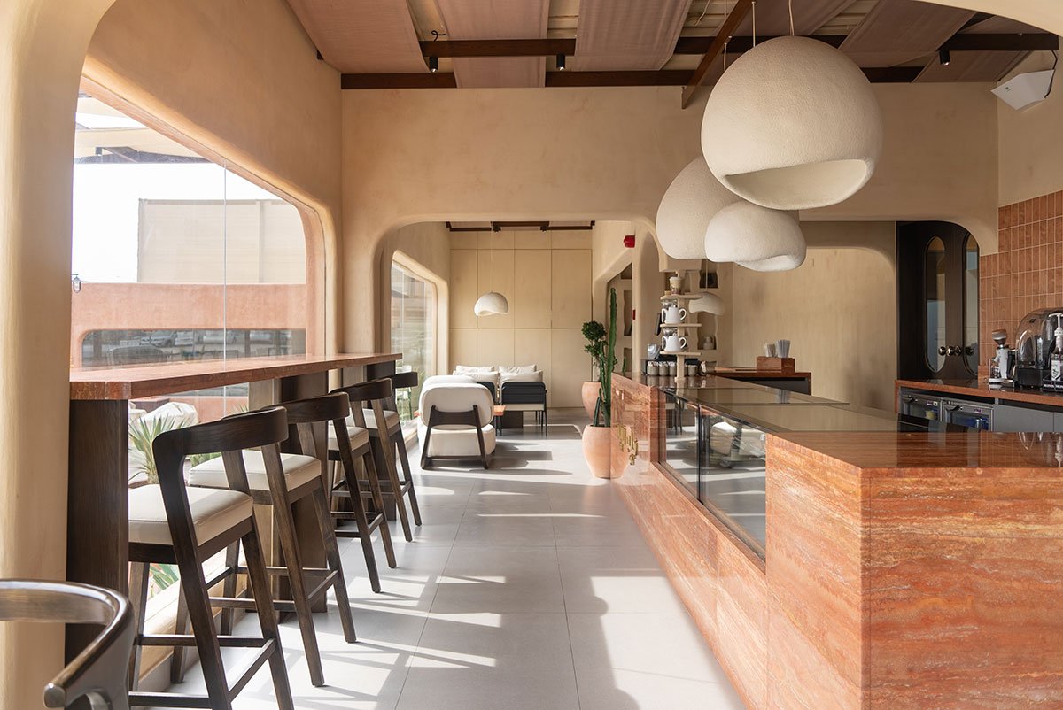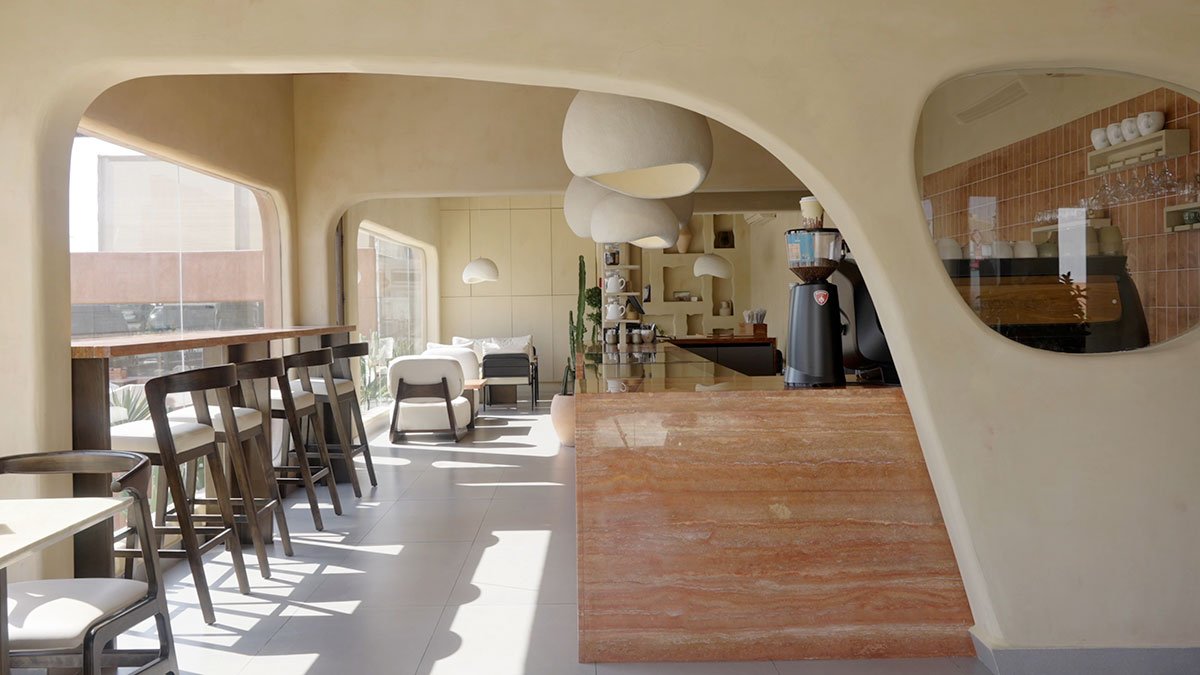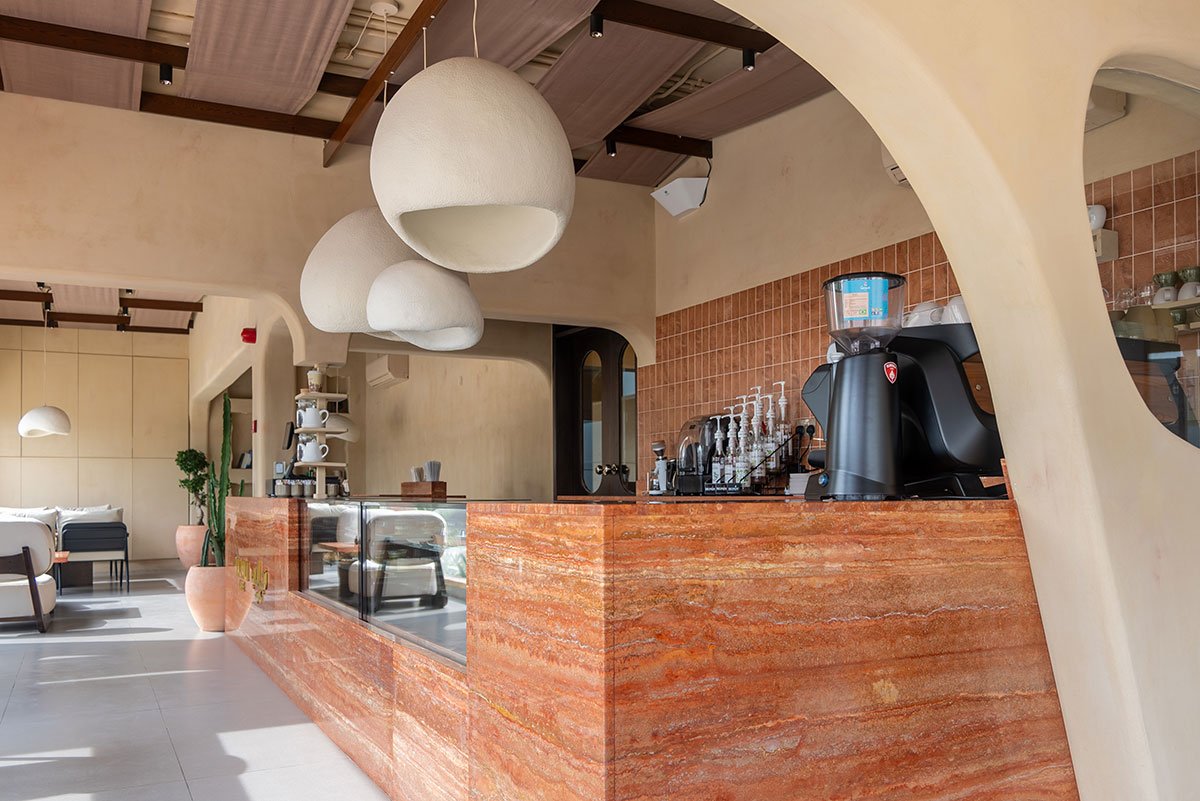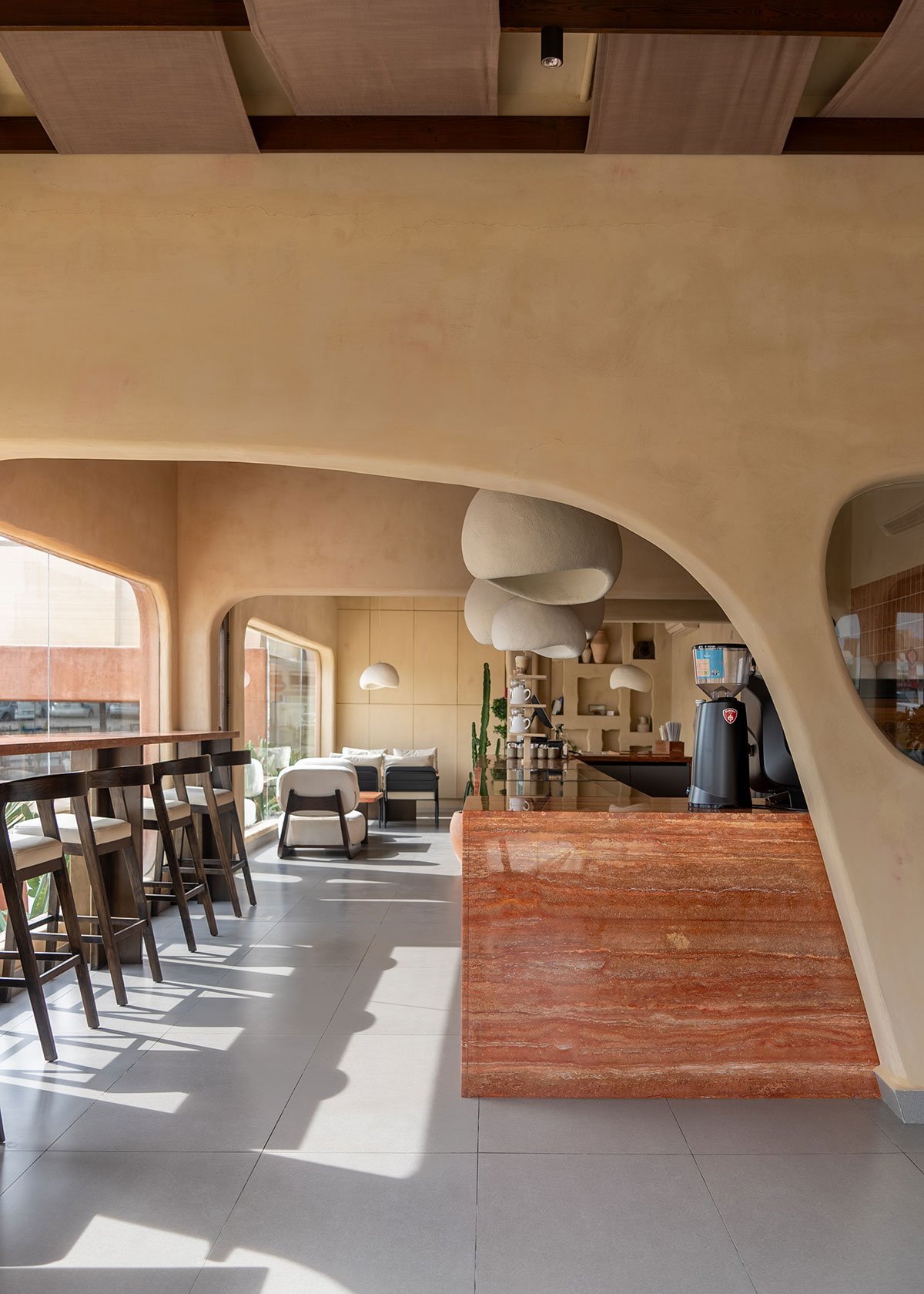 As visitors enter Najali, they are greeted by a striking café counter crafted from natural red travertine. This centerpiece seamlessly integrates a pastry chiller, while a floating pillar above doubles as a functional, minimalist rack. Behind the counter, red brick tiles create a textured backsplash, adding depth and warmth. The walls, painted in a textured beige tone, reflect the endless sands of the desert, creating a calming and grounded ambiance. Even the low-height beams of the original structure have been embraced, reshaped into flowing curves that mirror the natural contours of the landscape.