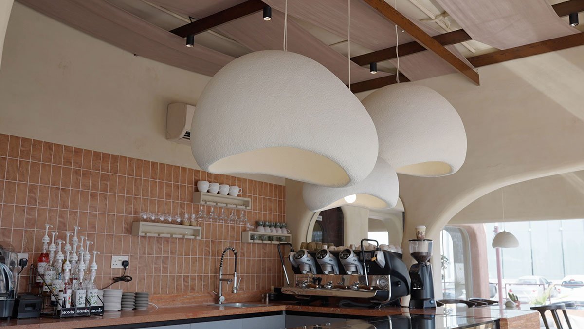 The dining area is designed with a unique character, partially separated by a wall with a circular glass opening that enhances the space’s visual fluidity. Wooden and marble dining tables, paired with custom-made wooden chairs, provide an inviting setting for both communal and intimate gatherings. Lighting plays a critical role in shaping the café’s ambiance. Above the counter, three large wabi-sabi pendant lights serve as eye-catching focal points, while smaller versions illuminate the dining tables, casting a warm, cozy glow. During the day, the café is bathed in natural light, while in the evening, the lighting transforms the space into a warm and intimate retreat.