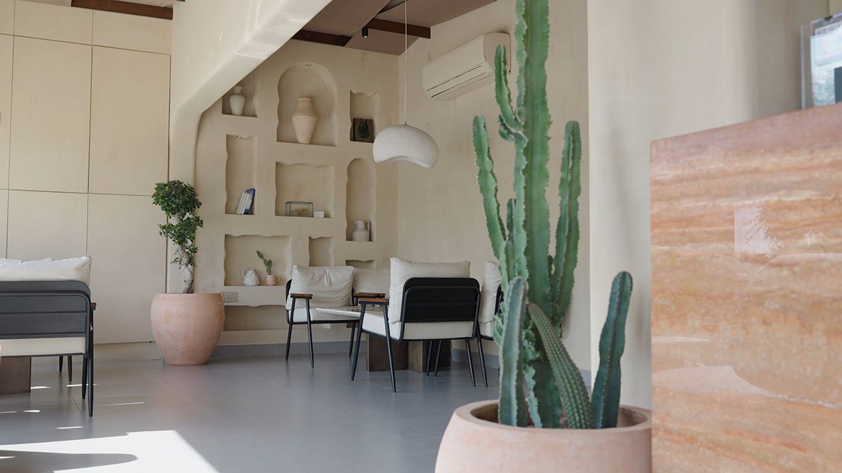 Throughout Najali, plants and pottery inspired by desert flora enhance the overall ambiance. Carefully chosen desert cacti and earthy pottery add life and texture, complementing the natural tones and materials of the design. These elements bring the essence of the desert indoors, creating an oasis that feels alive and connected to its surroundings.