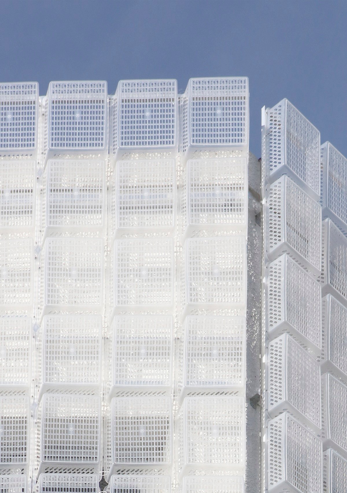 As a flexible architectural element rather than a fixed element, the wall consists of 1,500 structural semi-transparent basket surfaces. The surface minimizes the separation between the inside and outside, light and silhouettes beyond the space show through.
