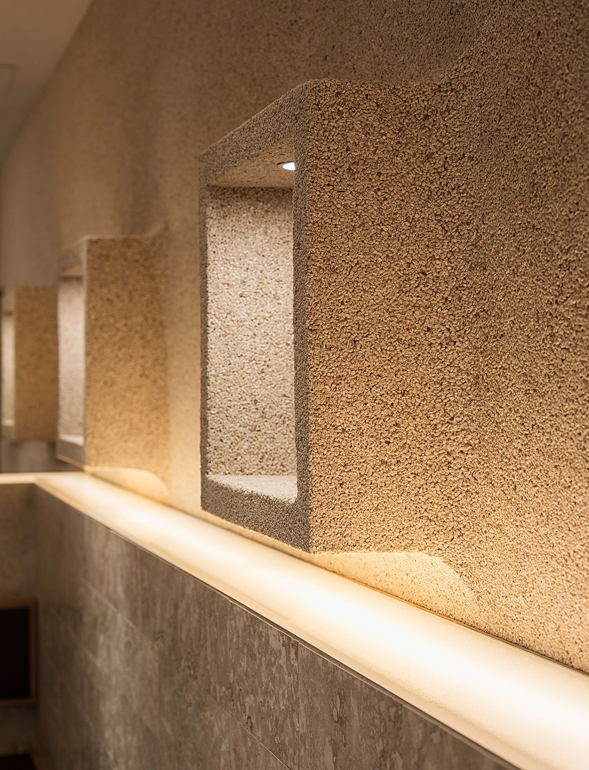 In detail, the design also consists of “the room of stones” and “the room of Tatami” with Okinawa traditional materials: Ryukyu Limestone for the spandrel walls instead of Oya Stone; Ryukyu Tatami for flooring; Okinawa Mincer Fabric for the partition curtains; and so on. These materials unwind the nature and cultural traditions of Okinawa, while articulating the spirit of Nanaha as tea master with the iterated tea room.
