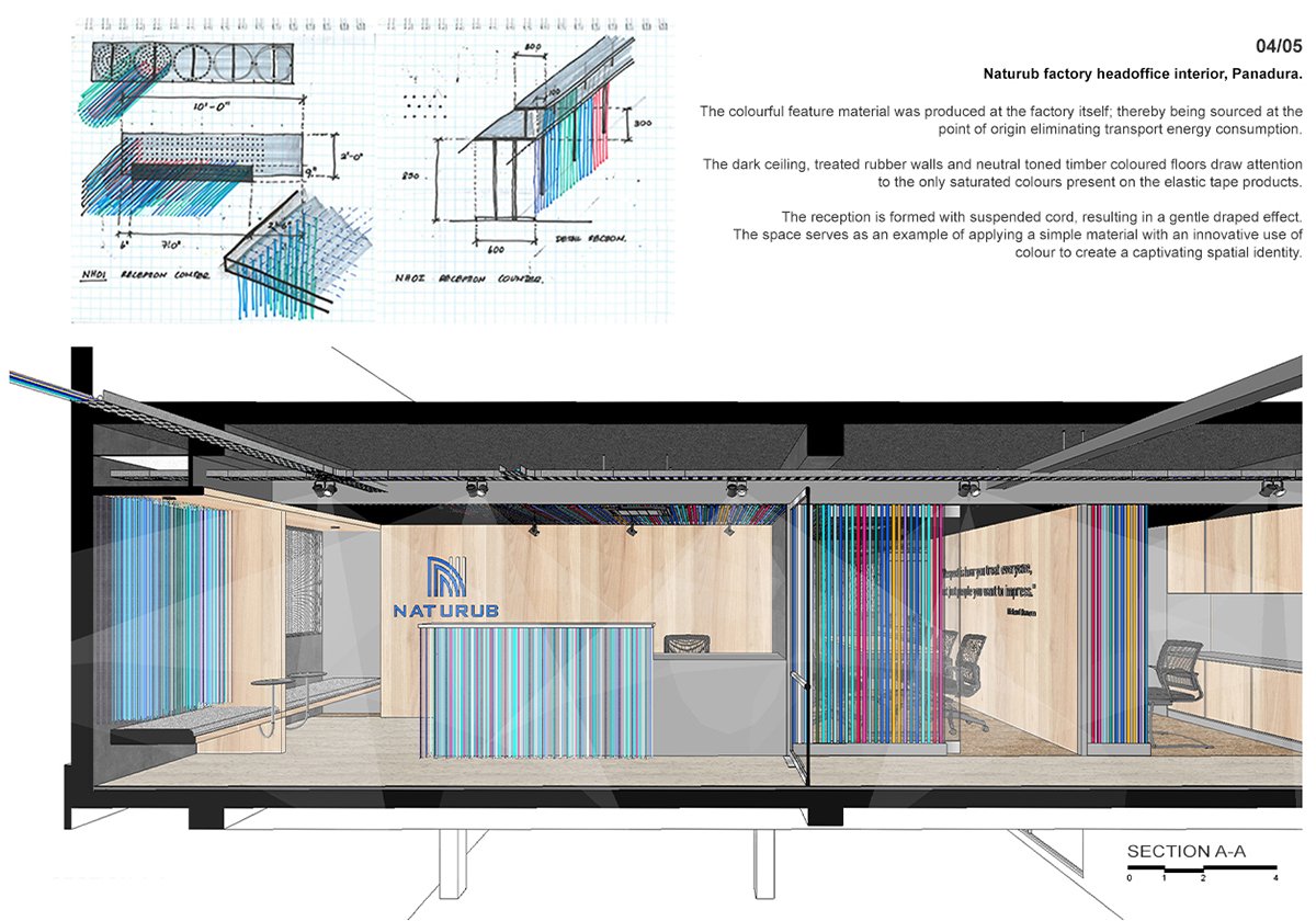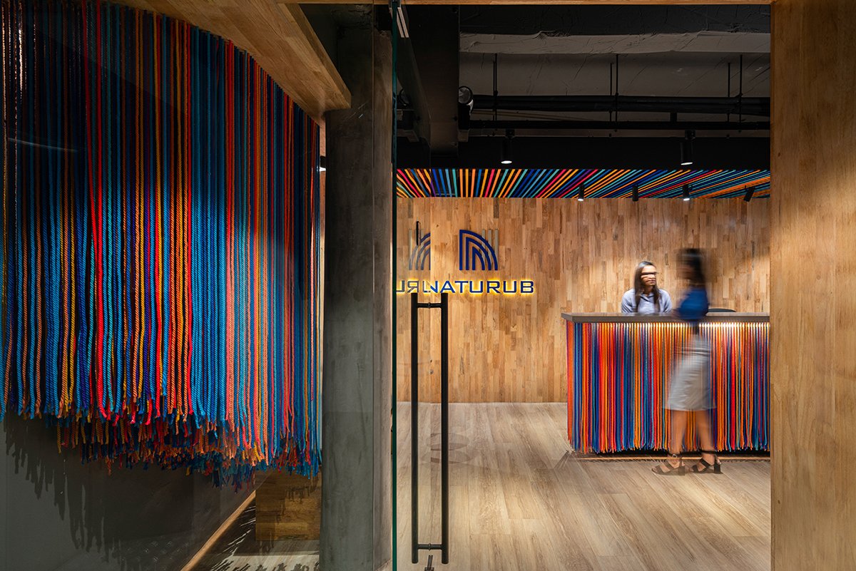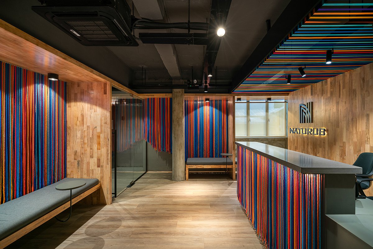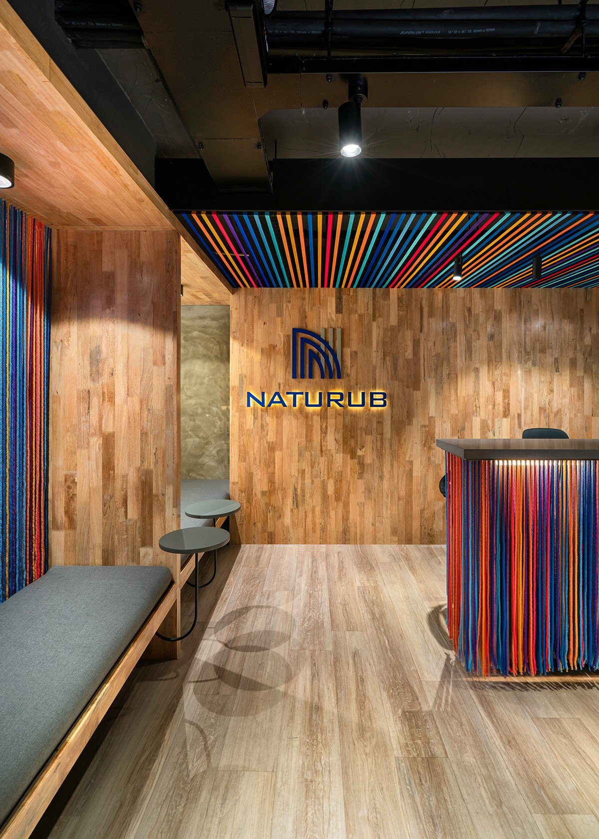 Excerpt: Naturub Factory Head Office by ICONCAST Chartered Architects transforms constraint into creativity, using locally sourced materials and the company’s own products as its design elements. Inspired by Naturub’s colorful tapes and fibers, the interior forms a vibrant core installation, while muted tones of rubber, timber, and dark ceilings frame it. The result is a functional, resourceful workspace with a unique spatial identity rooted in the brand itself.