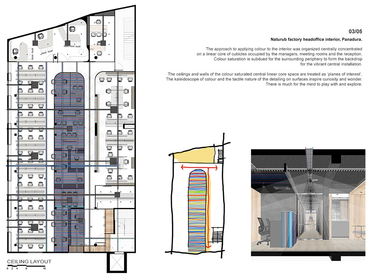 [Text as submitted by architect] The project is a single level 4700 Sq Ft. interior refurbishment for Naturub Head Office. Naturub is a Sri Lankan apparel accessories manufacturer passionate about the products and the people they develop. It’s head office at the factory complex in Mahawila, Panadura, needed refurbishment. Naturub’s existing office was a space resulting from time to time extension and addition of departments and personnel to the floor in alignment with the company’s growth and they recognized the need to organize the office to a functional arrangement for its effective and efficient operation.