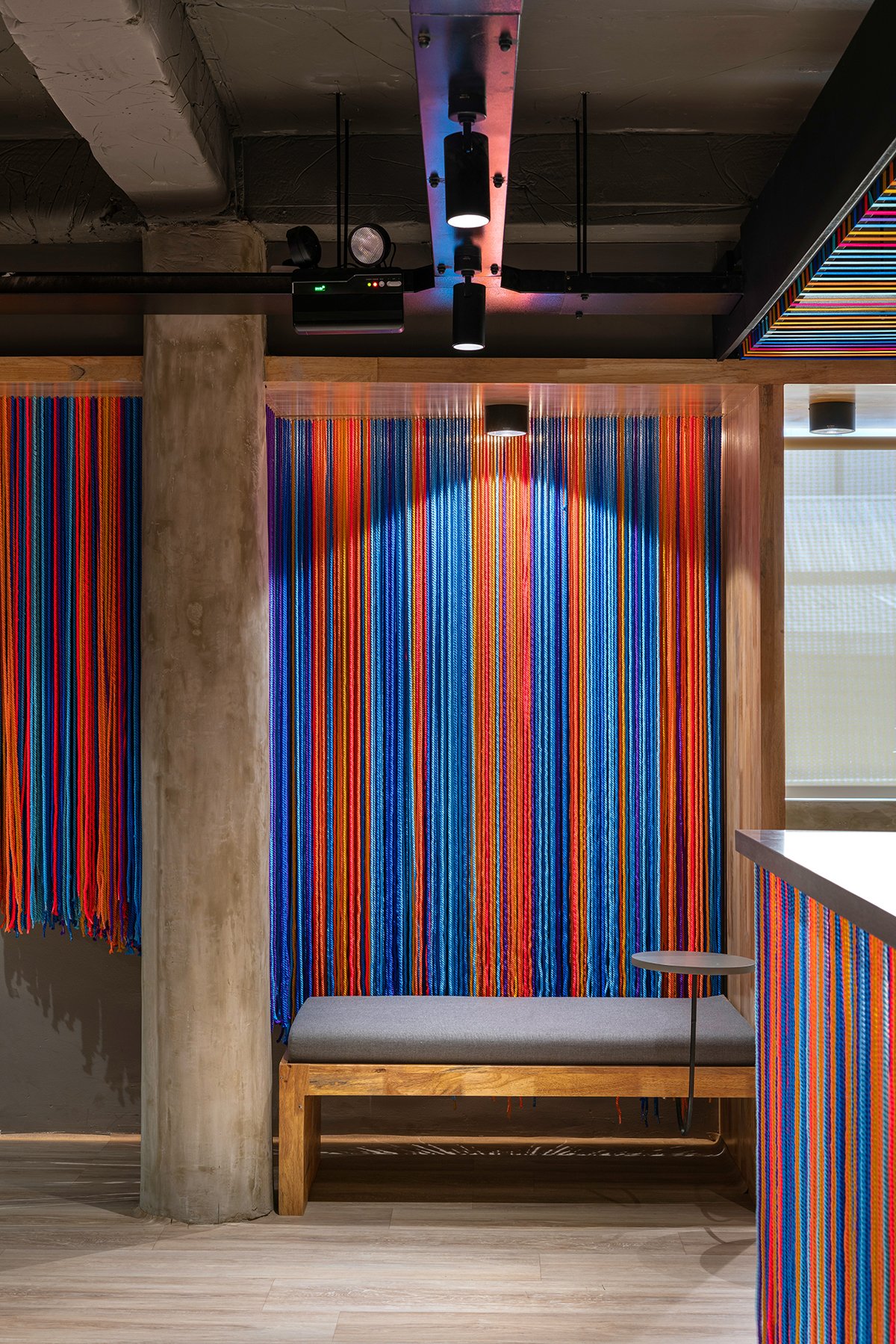 The dark ceiling, treated rubber walls and neutral toned timber coloured floors draw attention to the only saturated colours present on the elastic tape products. The lightweight tapes bursting in colour wrap the partitions and ceiling in tension adding the only effervescent colours to space.