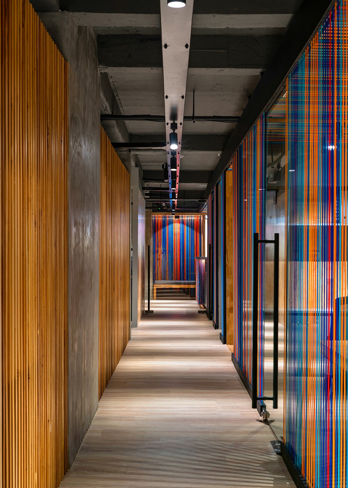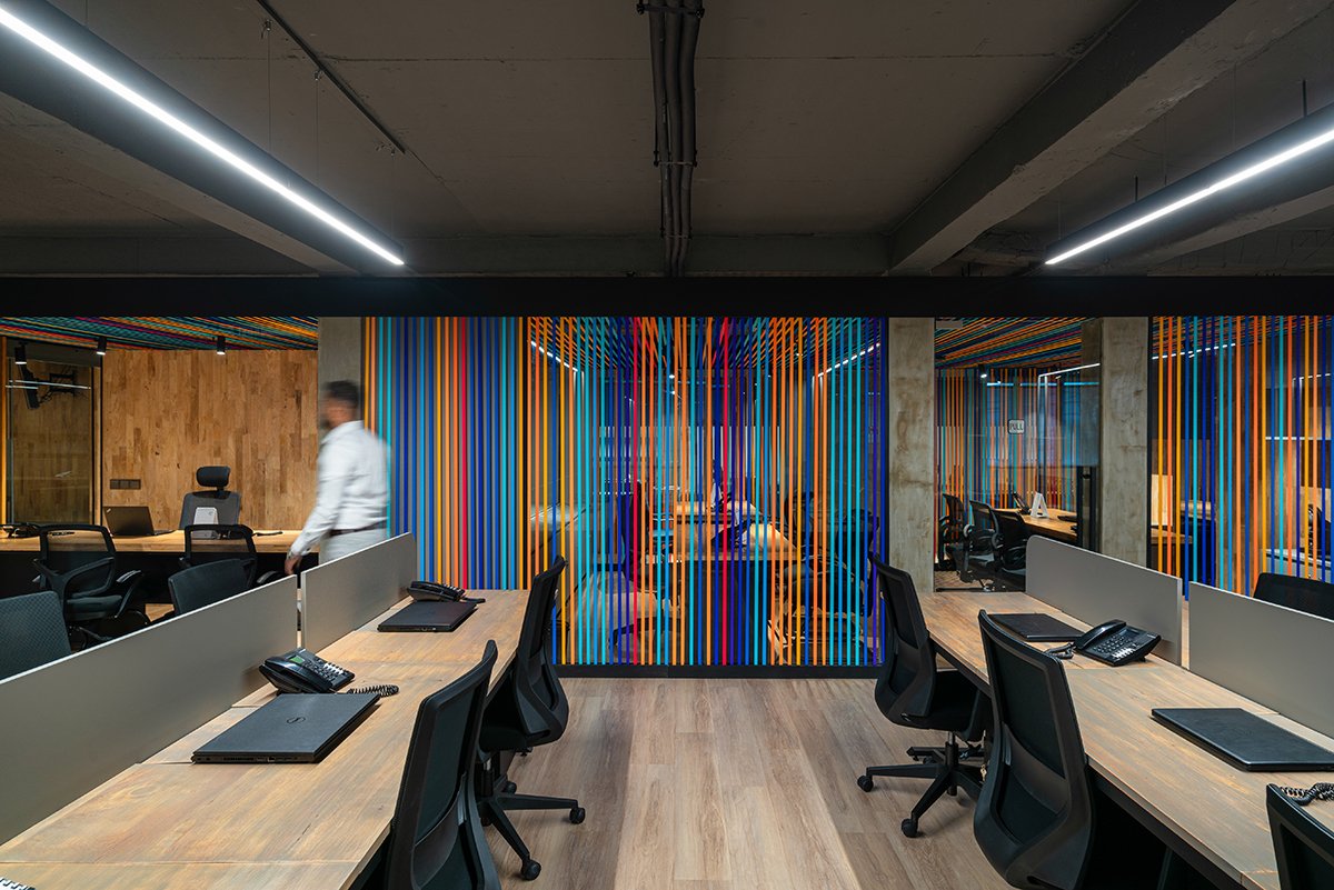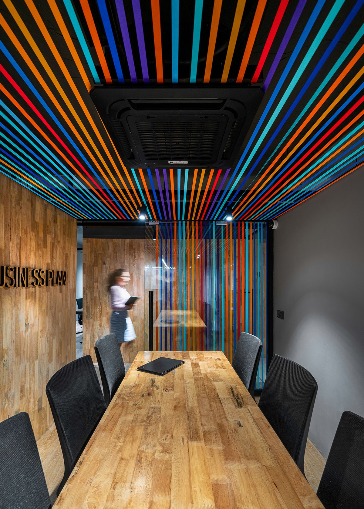 The programme for applying colour to the interior was organized centrally concentrated on a core area of cubicles occupied by the managers, meeting rooms and the reception. Both the ceiling and walls were donned with a high saturation of colour at the center and are treated as ‘planes of interest’. Colour saturation is subdued for the surrounding periphery to form the backdrop for the vibrant central installation.