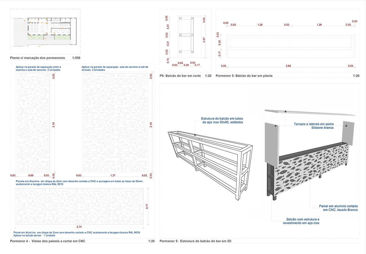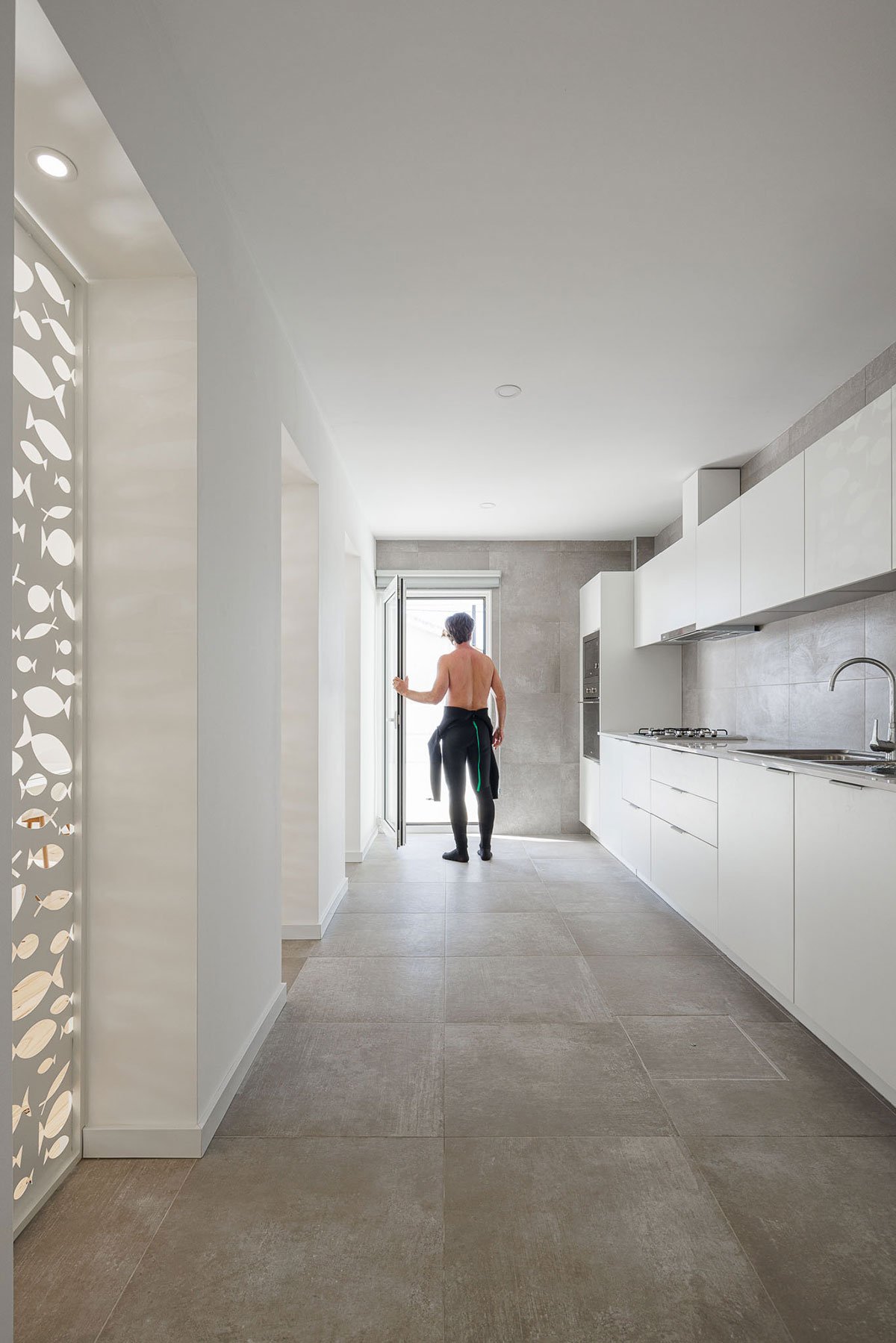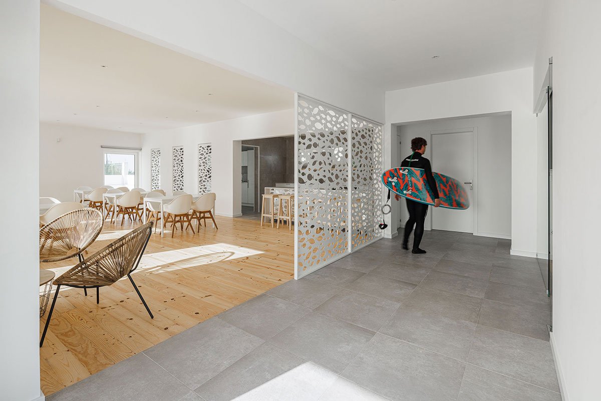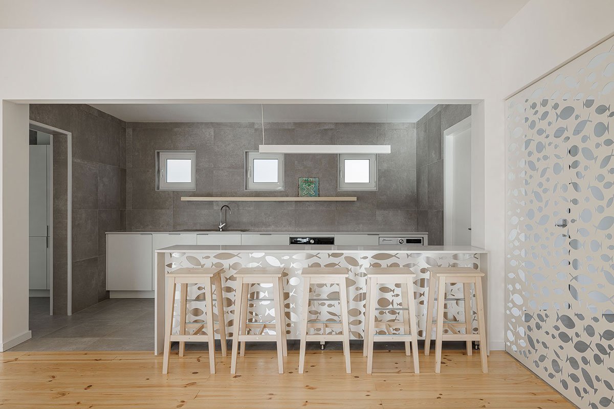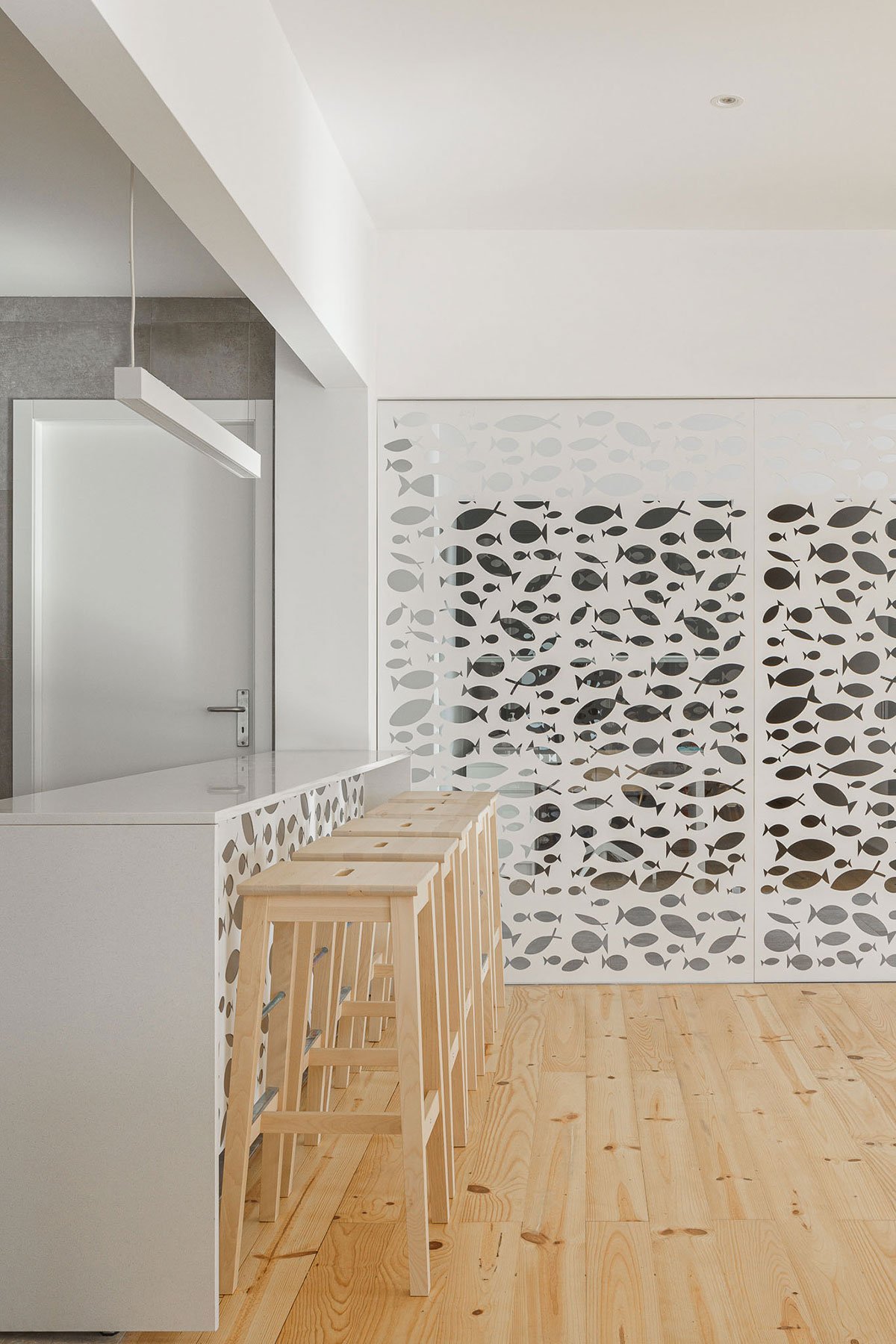 We converted it into a training center for the development and promotion of water sports, and we presented our best solution with a reduced budget for the project and work. New internal spaces were created to achieve the owner’s goals, and the flooring in the old classrooms was maintained because it was made of high-quality solid pine wood. In order for the interior to be reminiscent of the sea, aluminum panels were created with drawings of marine motifs cut in “CNC”, namely in the division between the hall and the living room and the bar counter.