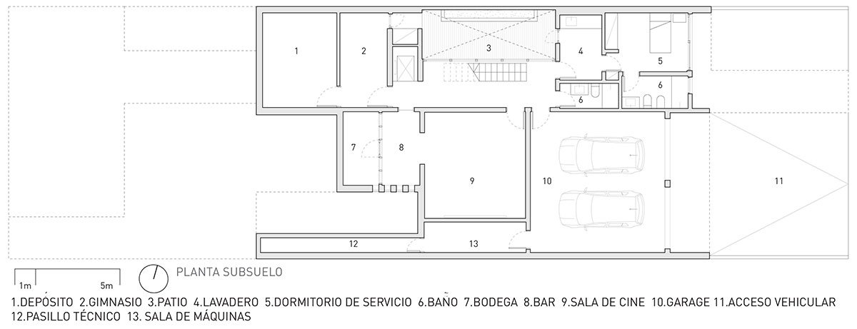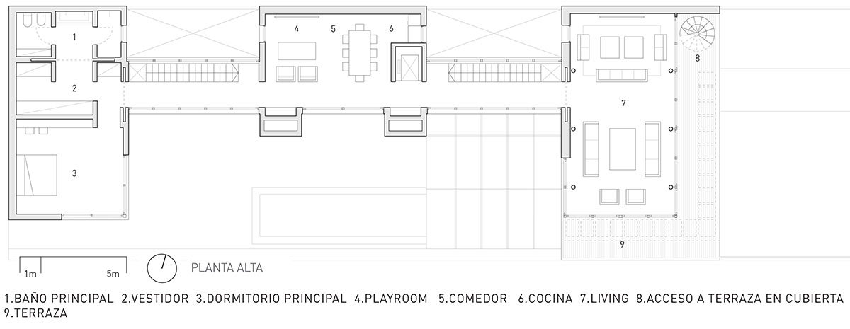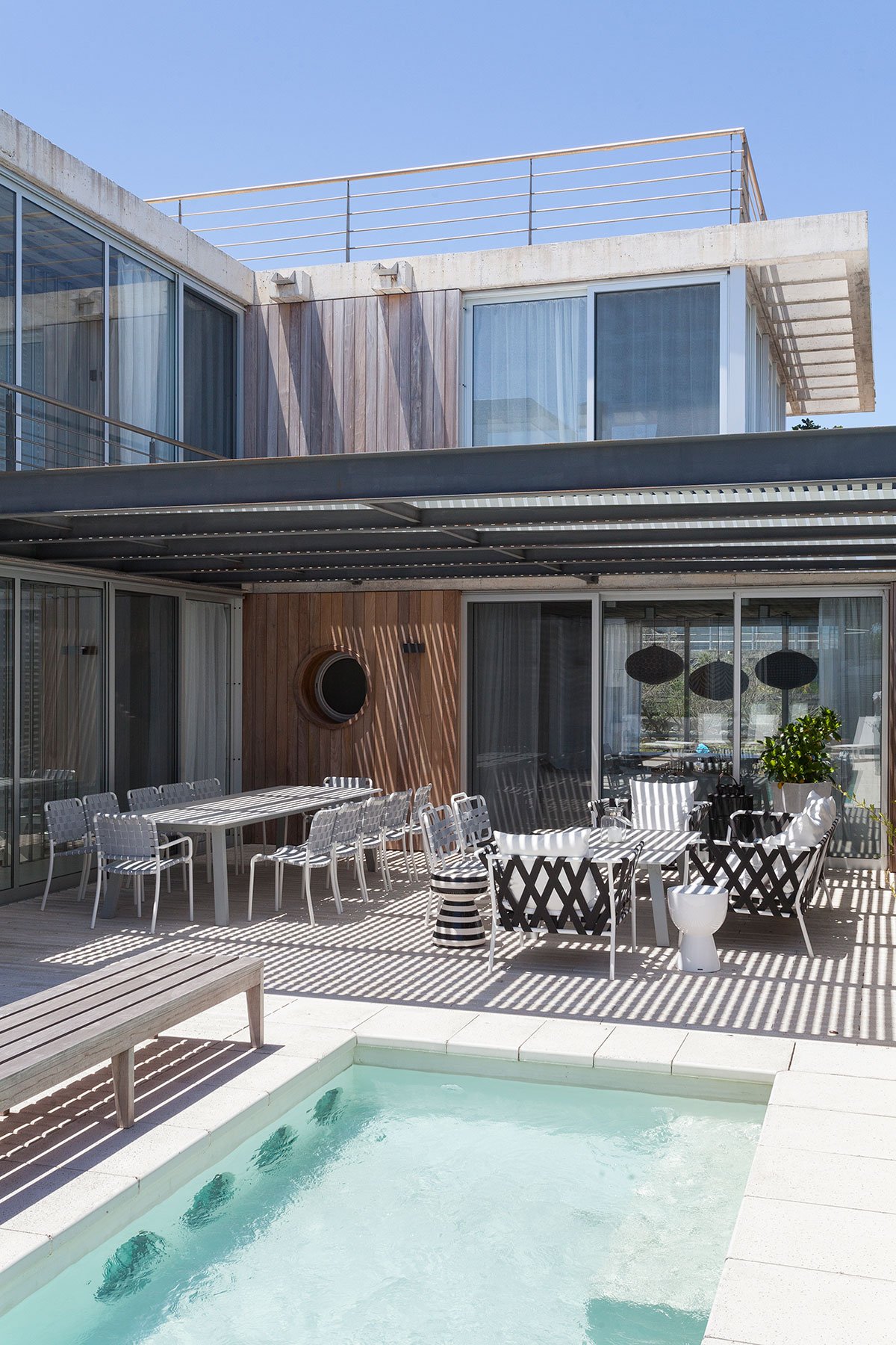 The great central courtyard with swimming pool and barbecue is the social area par excellence, and can be seen from every point in the house. Two other smaller courtyards open the house to allow natural light into all rooms. Nautilus has a movie theater, a wine cellar, its own gym, and extensive bookcases in the playroom. Ample recreation space was necessary for this summer home for a large family, combining interior comfort with its incorporation into the urban landscape of the Manantiales shoreline.