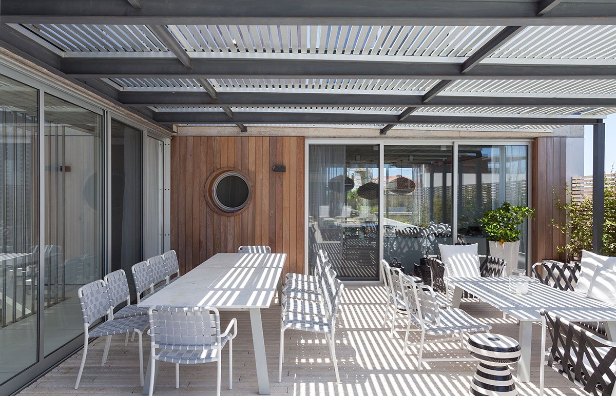 The facade recalls the deck of a ship, a feeling which increases due to the use of porthole windows throughout the house and the spiral staircase which leads to the sun deck. The interior of the house is totally clad in white painted wood. On the other hand, the bathrooms are luxuriously clad in marquina marble.