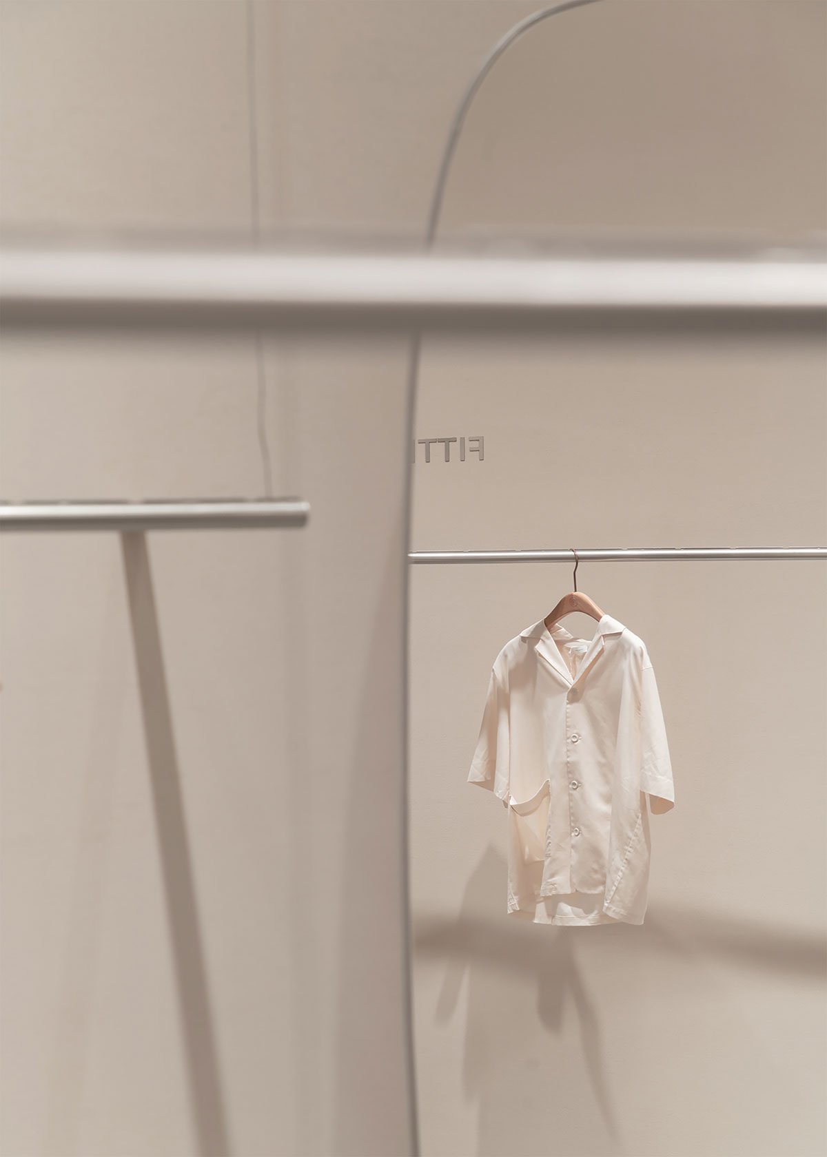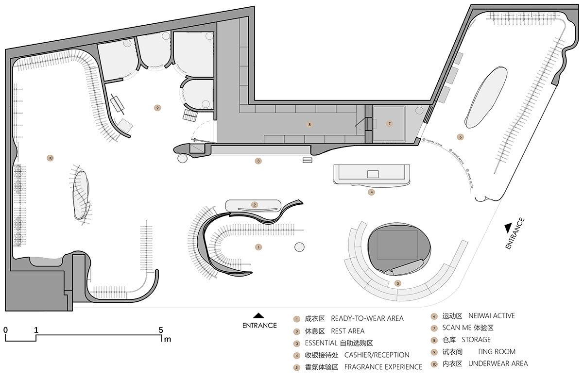 The curved wall in the central area of the entrance has the function of streamline organization and functional division. The area covered by the rising side of the wall is the intimate underwear product area and fitting room. The center of the low wall encloses the home wear and display series of ready-to-wear, which fits the brand’s progressive level from the inside to the outside.