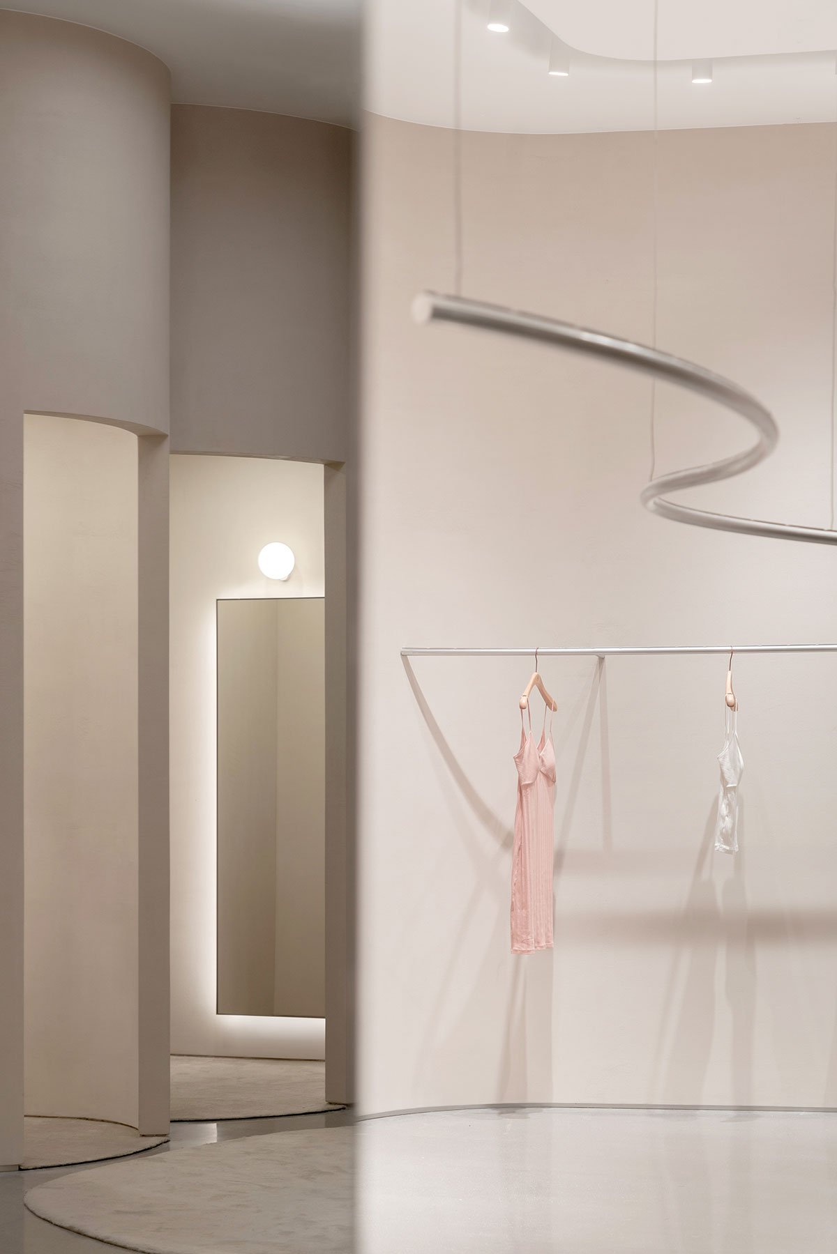 Excerpt: NEIWAI Concept Store, an interior design project by SLT Design, promotes women’s diverse beauty by incorporating flexible female body contours into the space. Space props and walls constitute the “deconstruction” concept of the whole store. Dynamic curves, combined with static physical entities, create an aesthetic difference, enhancing memory points and creating a sense of ups and downs in the space.