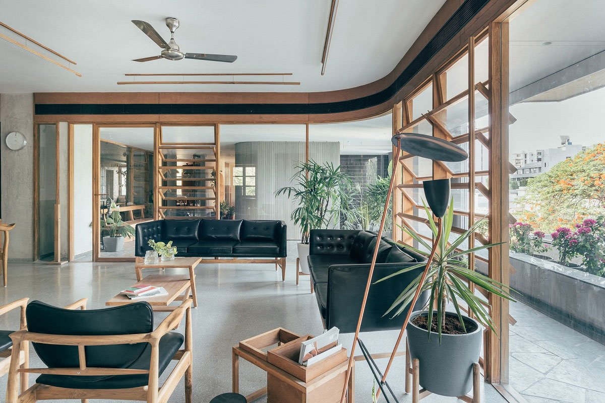 [Text as submitted by the Architects] The workspace lies on the third storey of a newly built tranquil structure enveloped by a large number of trees and openings that allow ample of daylight and ventilation throughout the space. Located in one of the most posh areas of the city, the design justifies the elite surroundings through its forms and spaces that keep the interior isolated yet connected to the external environment.