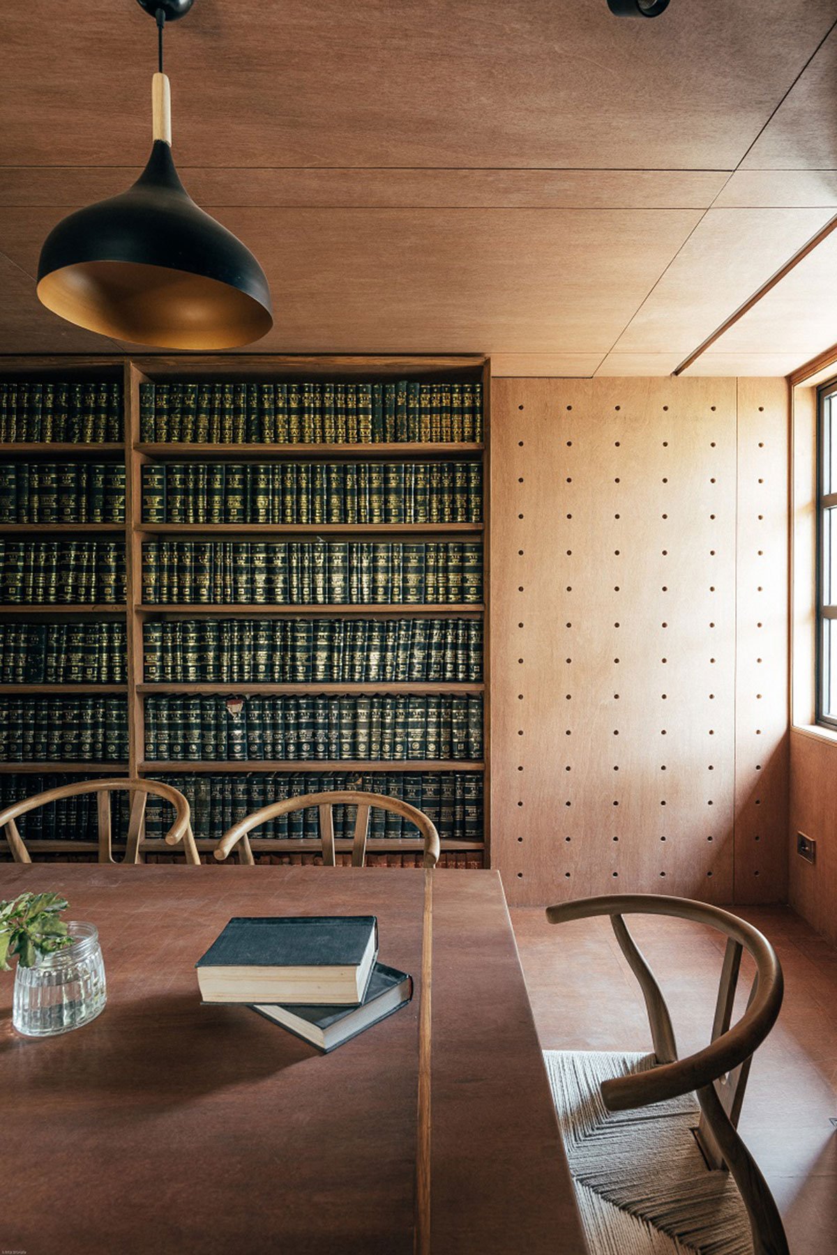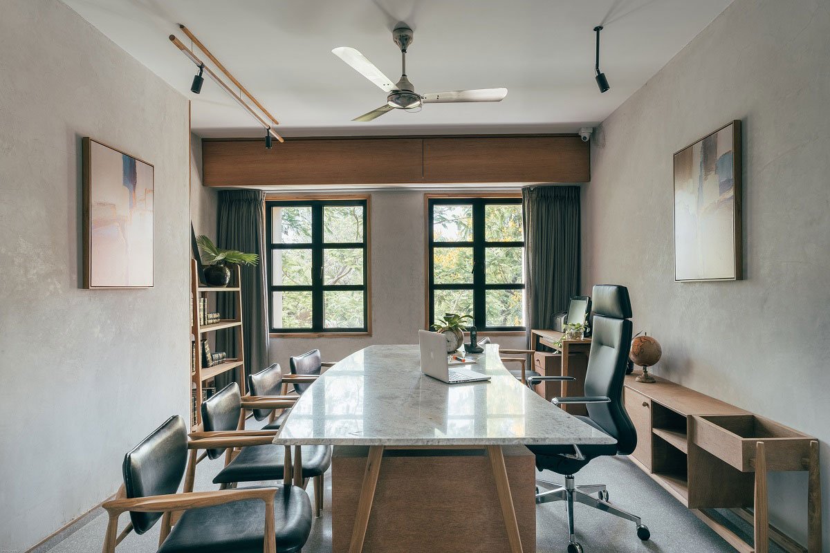 Conference being a concentrated task, the space has minimal light intake keeping the material palette neutral.