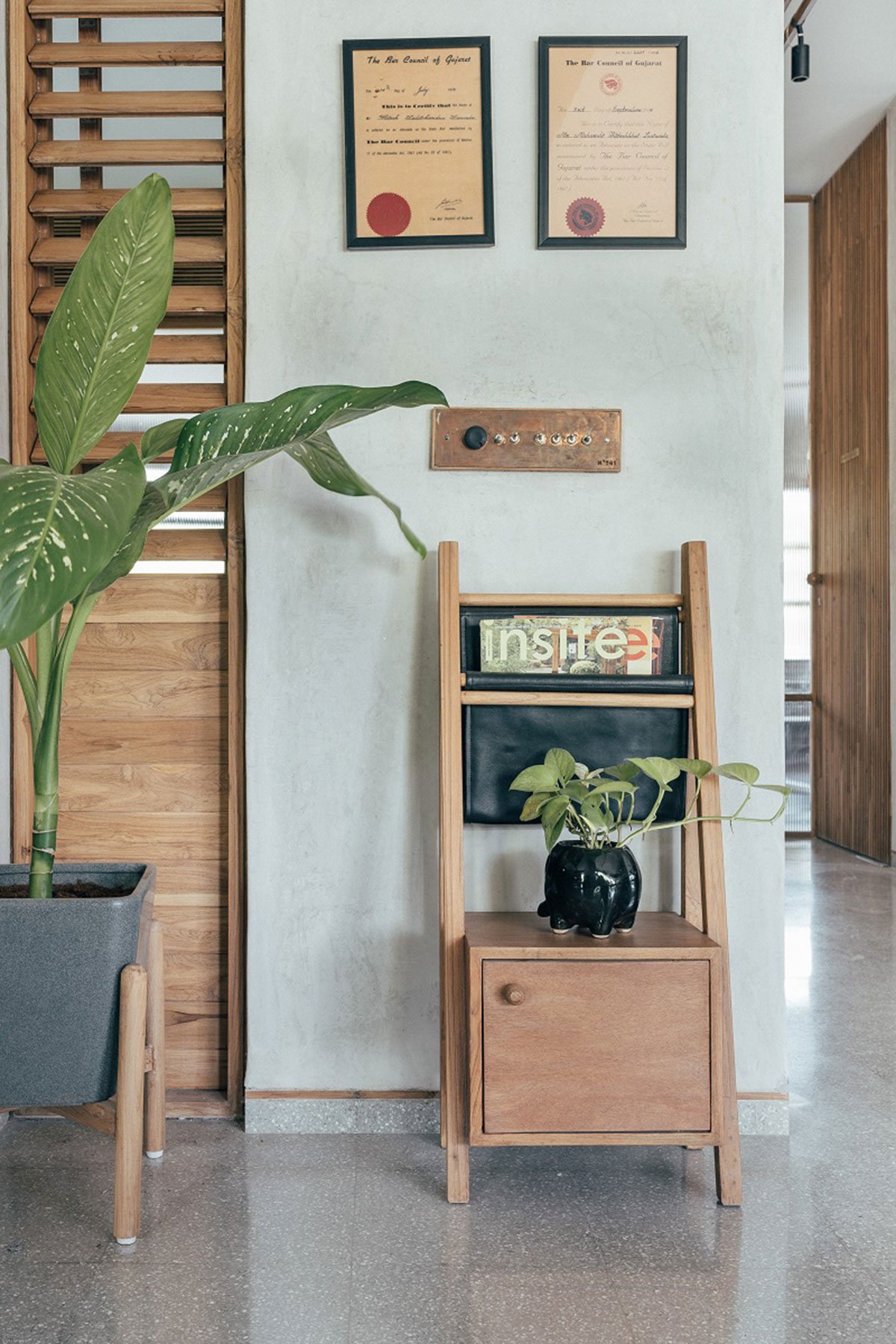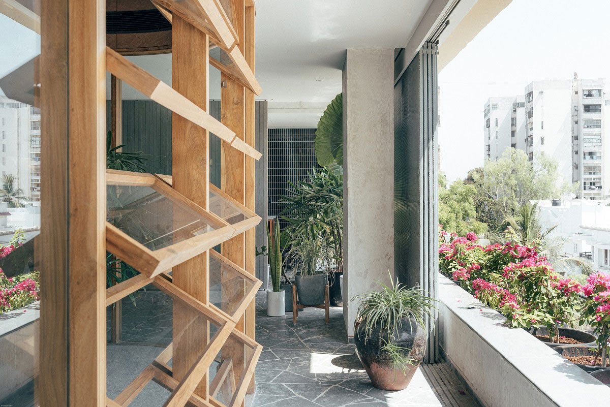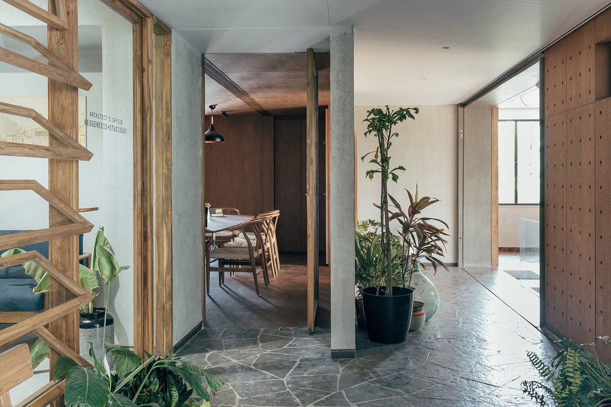 The passage clears into regular Kota foyer with interior scaping to make a natural, good environment while adding aesthetics to the space. The space is featured with bigger opening made by expelling north east wall and combined with perforated GI sliding screens for security and vision. The main foyer further leads to two separate offices – the architect’s studio and advocates office.