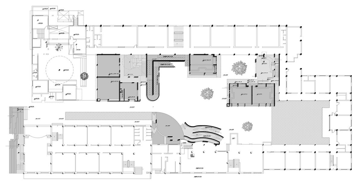 [Text as submitted by architect] So as to create spaces where a student and teacher can come together and interact, we decided to anchor the new proposed blocks along the periphery of the space and orient them towards the central larger gathering space. A series of courtyards were perceived such that one big space gets sub volumes and the journey from one space to another is like an unfolding of spaces offering discoveries of new elements, each time a student or a teacher moves from A to B. This series of unfolding volumes retain the child-like curiosity inside a student.