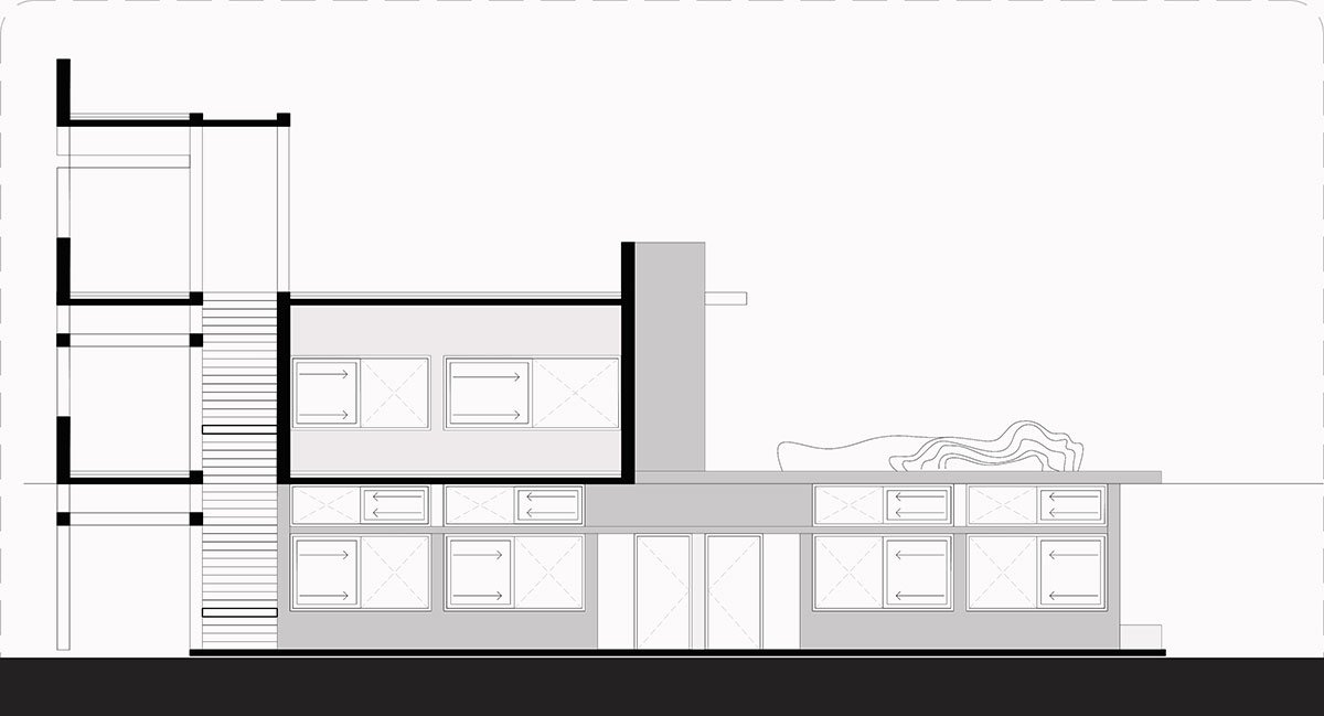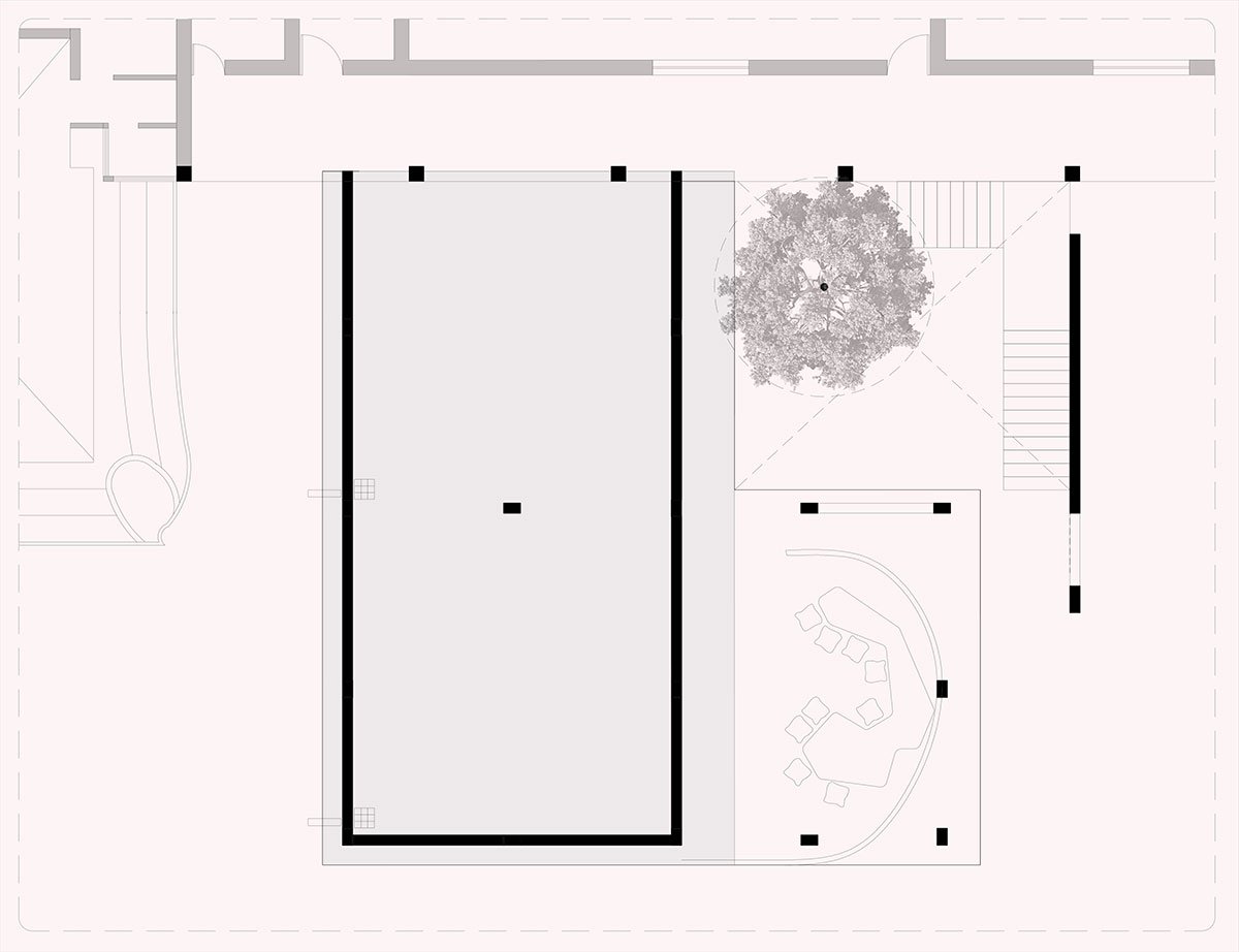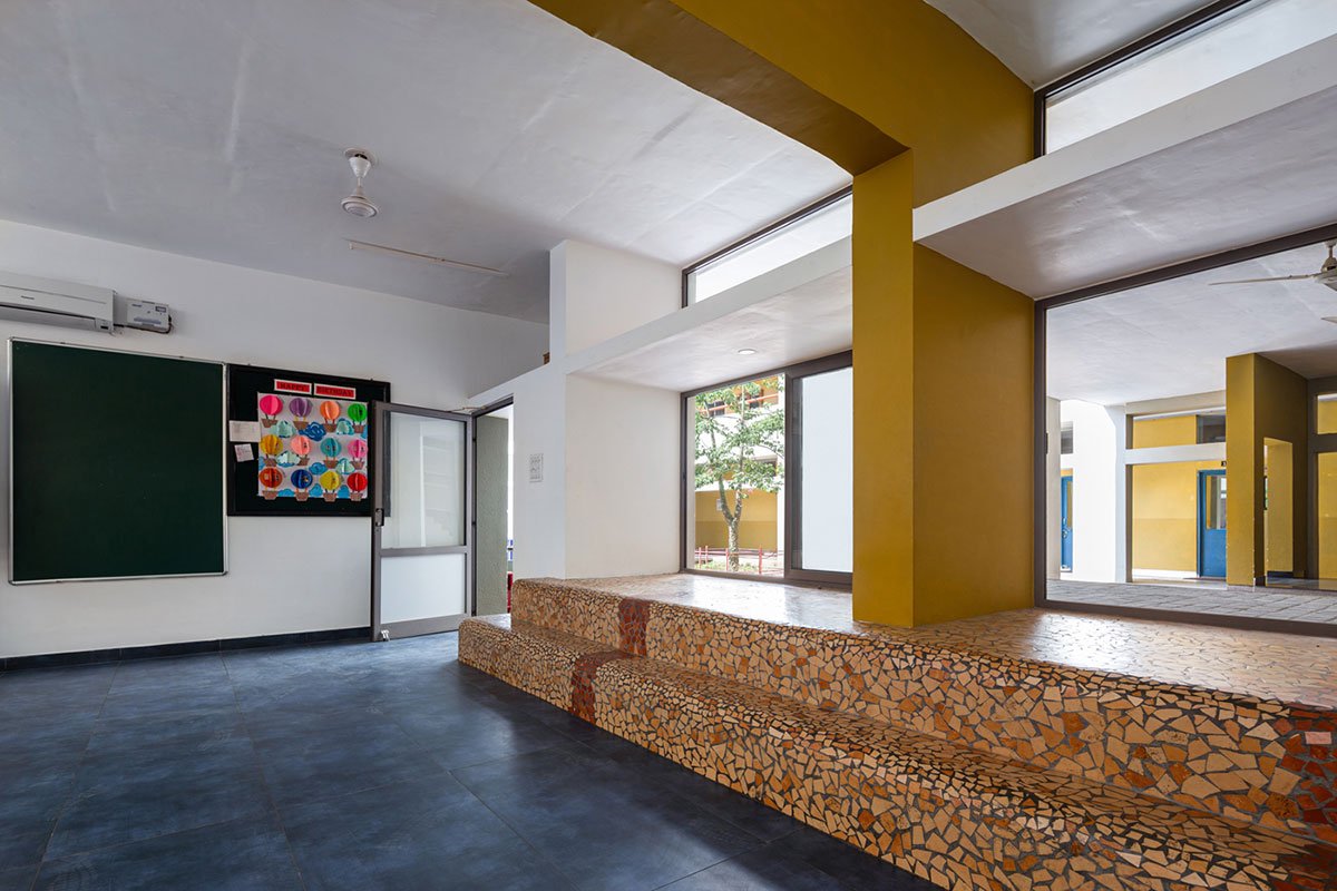 Stepped courtyard – The second block has classrooms for the senior children, as a result, the courtyard space in this block behaves differently. The lower level has a staffroom and classrooms together, hence the connection to the upper level is via a stepped staircase that encourages students and teachers to sit and discuss subjects informally. This access leads to the outdoor informal seating at the upper level connected to the Library block.