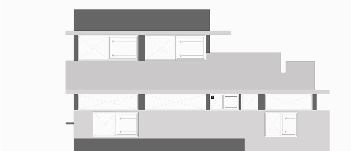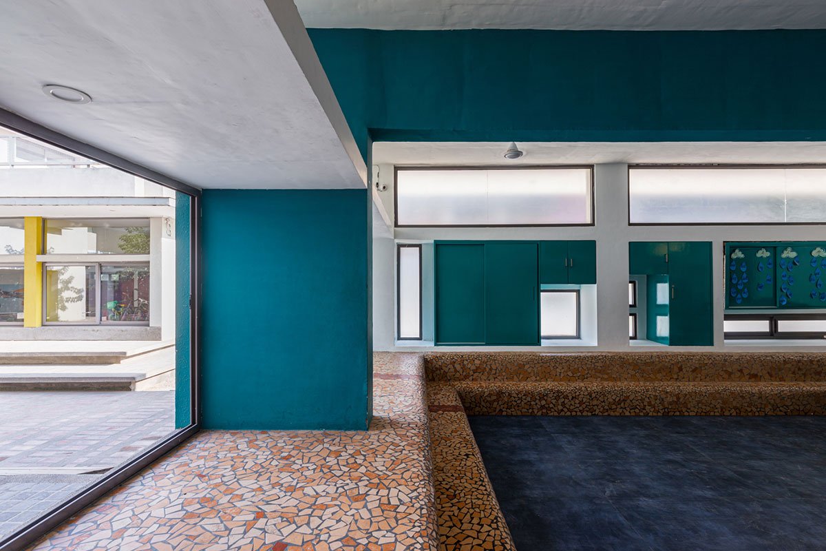 This projection also helps create the form of the building. Also, we introduced recessed square openings at lower heights for kids to peep out and see the outer world their own way. These openings got natural rainwater projections because of their form. These were aesthetically treated from the inside and given colors as per the classroom type which helps kids identify their spaces and also leaves a larger impact on their memories with the classroom. The window opening towards the other side is raised above 7’-0” and received natural light from the ventilator above.