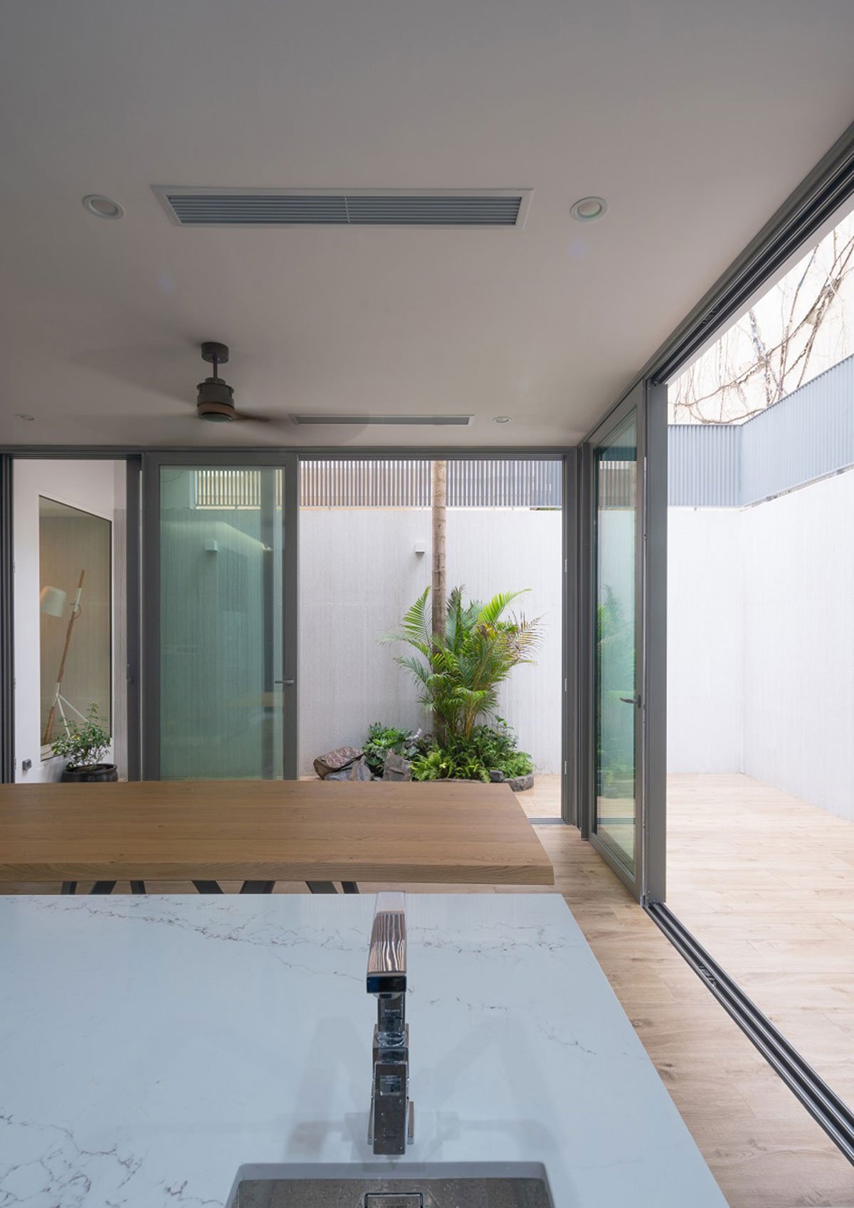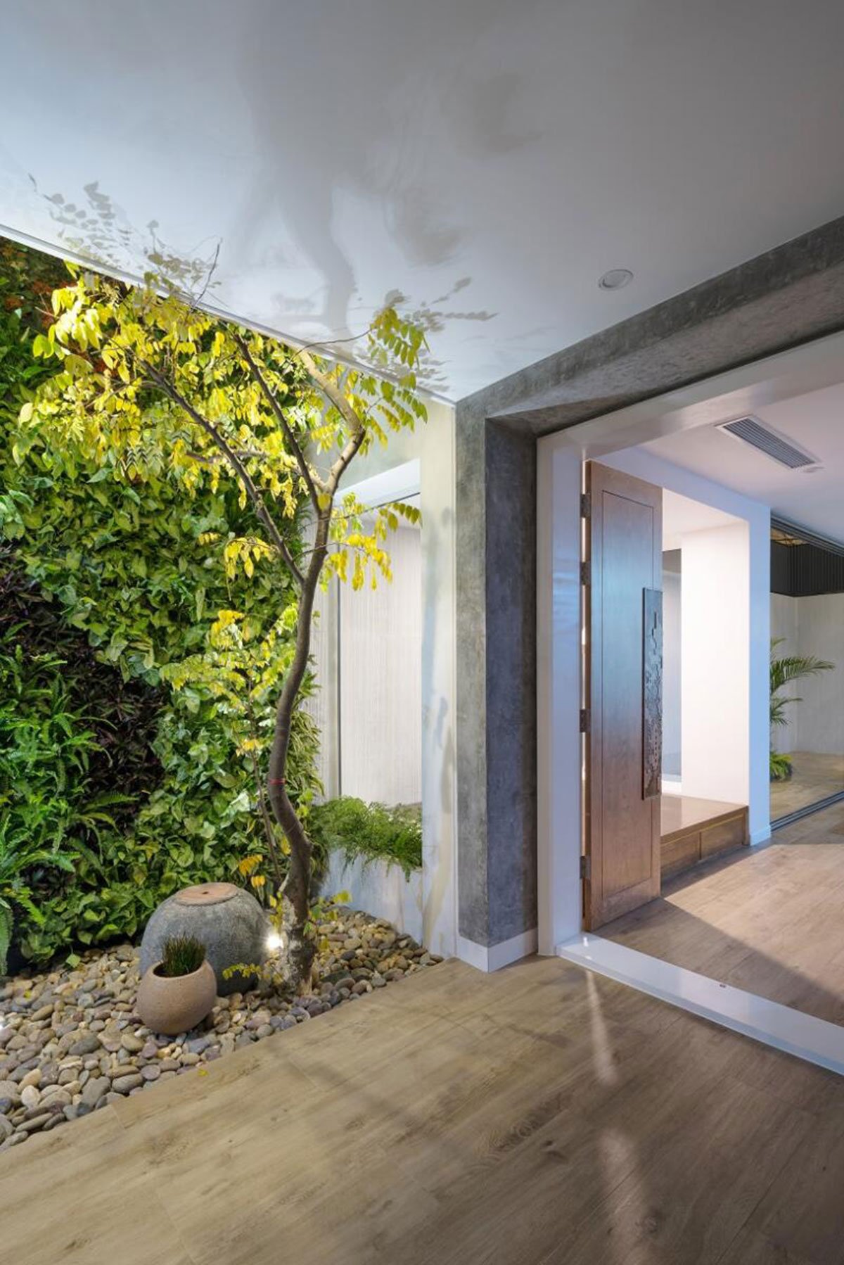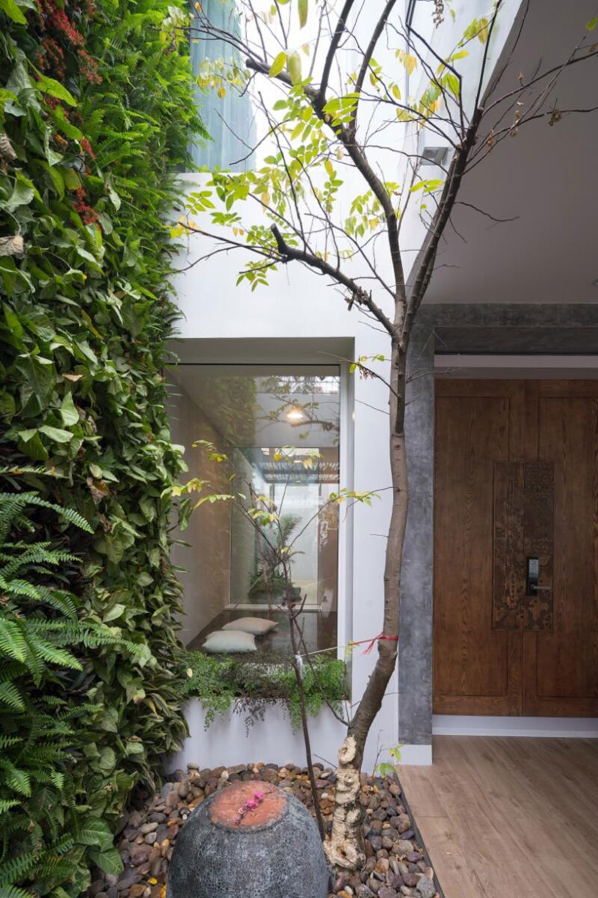 After nearly 2 years of construction, the house has finally been finished, satisfying initial expectations. Even the factors of greeneries, ventilation, lighting, water surface have managed to bring forth surprising vibes. Greeneries have become available everywhere; natural light, wind, and rain may go inside the house. Borders between Outdoor-Indoor, Above-Below have almost been cleaned out, etc. Wooden raw materials and fine details of Wood and Steel have been cut using the CNC techology so as to bring about special impressions on particular positions, thus, the house space has become very modern and comfortable while preserving the traditional essence of Vietnamese culture.