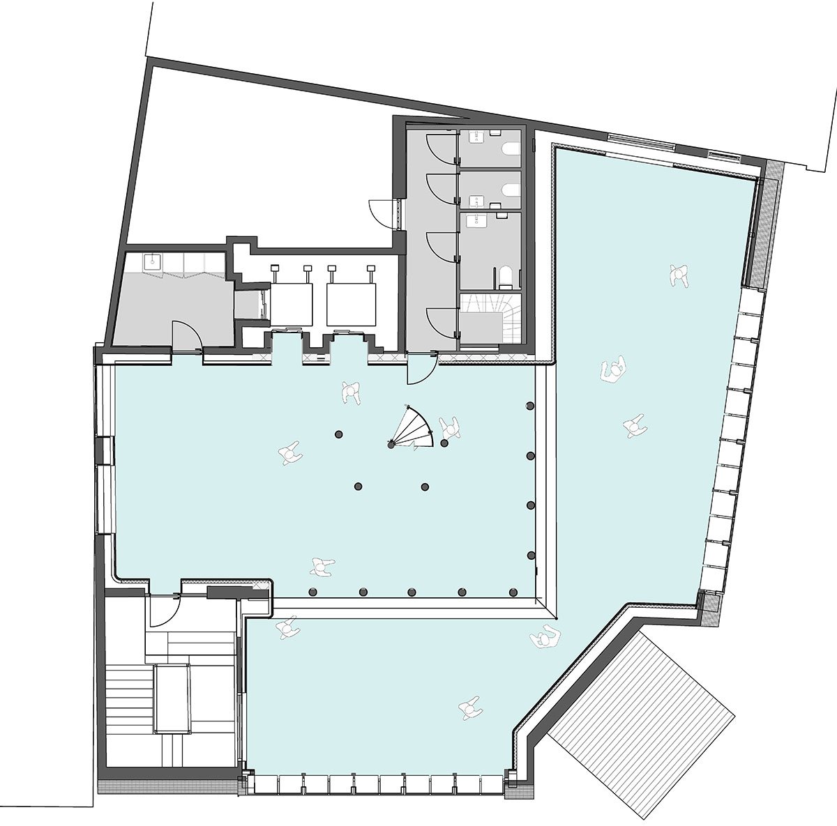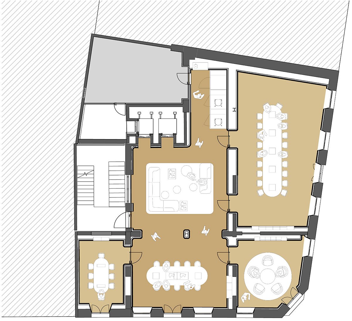 In MVRDV’s design the staircase, with its historic details once again revealed, becomes a central element of the design, and is always visible from the main spaces on each floor to help orient visitors. Throughout the project, the space is opened as much as possible to create a light and airy environment, removing internal walls, raising ceilings, and emphasising vertical connections such as the atrium that links the ground floor with the café.
