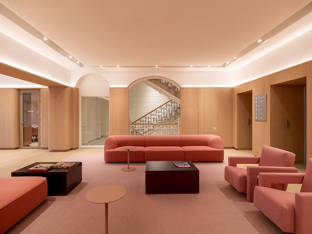 The design team devised a palette of materials that becomes progressively cleaner and lighter as it ascends the building, suggesting an atmospheric journey from earth to sky. On the ground and first floors, the walls are panelled with a 3D-printed material made from recycled drinks cartons, developed in partnership with Amsterdam-based Aectual, which gives an earthy colour and a fluted texture to the walls. Meanwhile the floors are made from Duracryl’s Durabella, a sustainable terrazzo flooring made with renewable resources. On the level above, the walls and floors are finished with wood, while on the third floor, wood floors are complemented with eco-friendly paint. The fourth floor features a peachy orange gradient on its walls, which draw attention upwards to the vaulted ceilings of the original building.