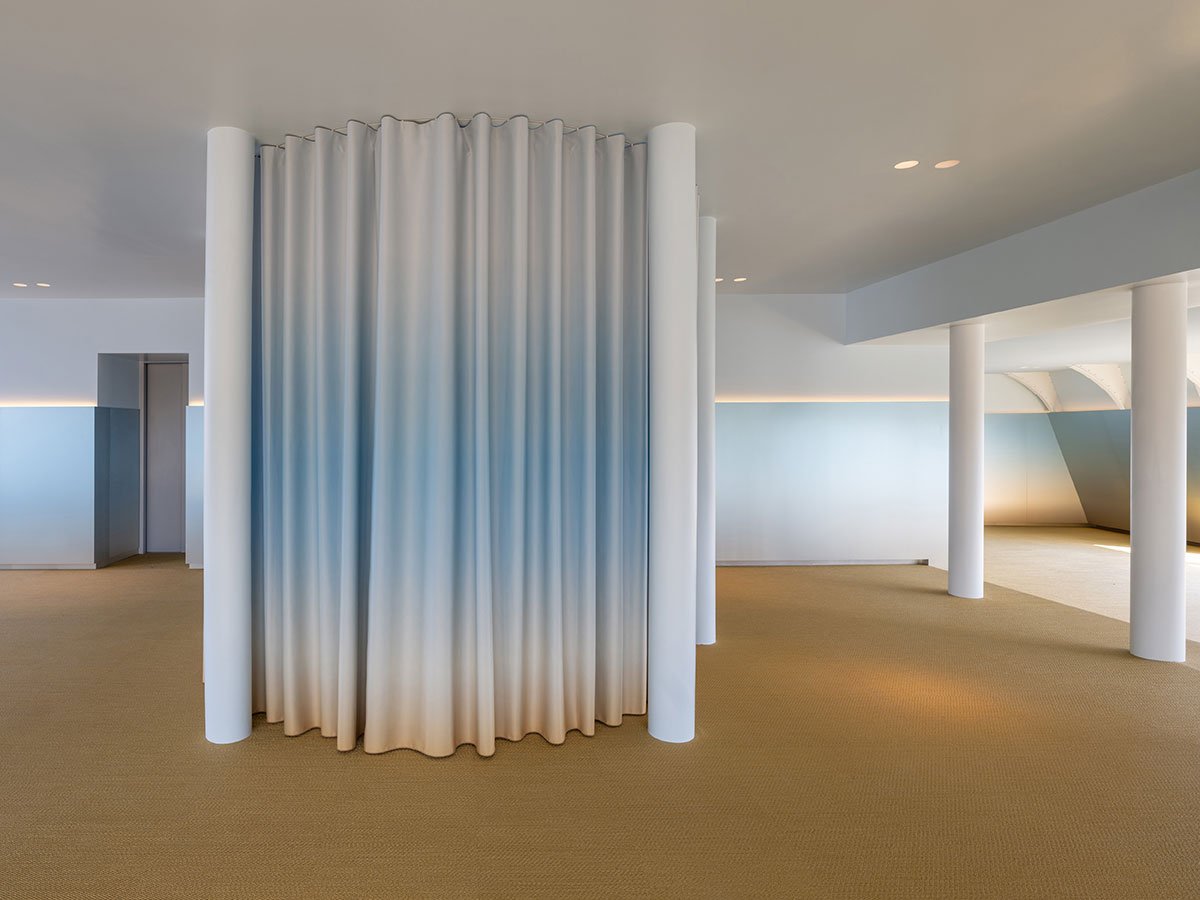 This gradual vertical change culminates in the top two floors. The walls of the sixth transition from gold to blue, leading into the sky-blue floor, finishes, and ceiling of the Rietveld pavilion. Here, the essence of this piece of modernist history is faithfully preserved, with refined finishes such as the carpet and curtains helping to make it an exquisite space for events such as galas and fashion shows just as it was almost 100 years ago. The glass walls of Rietveld’s design give panoramic views over the rooftops of Amsterdam, completing the feeling of expansive lightness and giving space for visitors to reflect on the future to come.