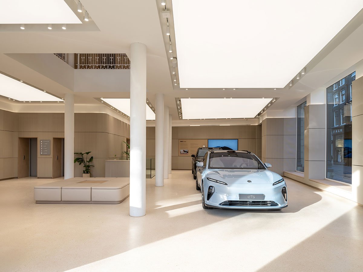 Excerpt: NIO House Amsterdam renovates a historic building with an interior design by MVRDV, which combines design elements reflective of NIO’s brand with a respectful treatment of the historic building. The store offers various spaces for relaxation, work, events, and exhibitions, with a color gradient inspired by NIO’s “blue sky coming” slogan. The palette ranges from earthy colours on the lower floors to an airy blue that fills the building’s modernist rooftop pavilion.