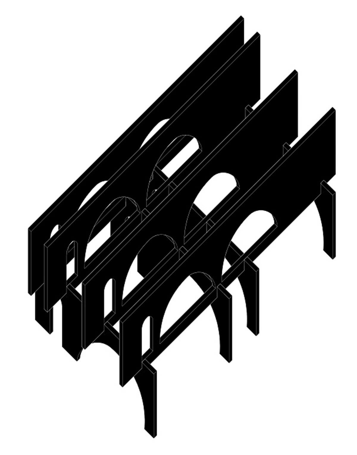There are only two panel types in the project; one for the ground floor running east-west parallel to the street, and one for the first floor running north-south pointing to the city. The four panels on the ground floor support the four on the first floor and interlock like a lattice, staying secured by gravity with some lateral bracing.