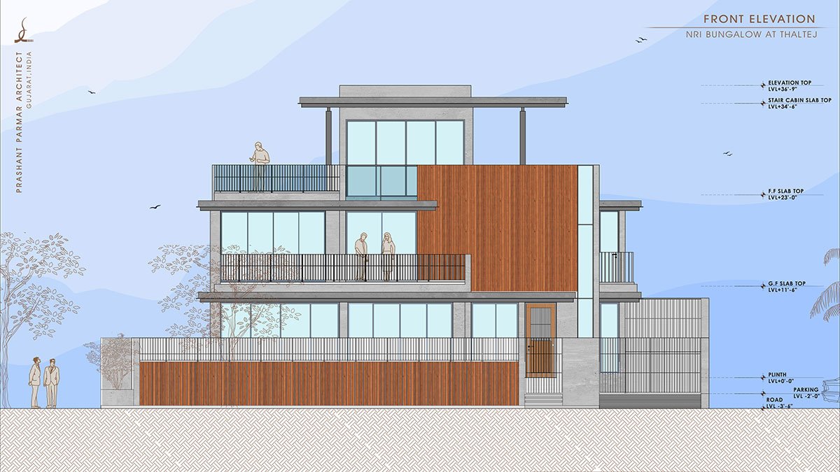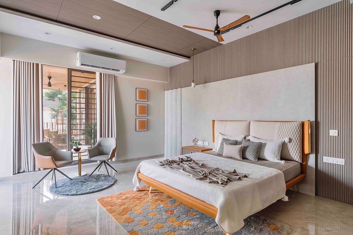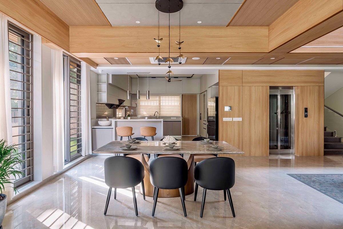Excerpt: NRI Bungalow at Thaltej by Prashant Parmar Architect – Shayona Consultant blends modern design with elegance to create a serene, timeless residence. A central courtyard ensures privacy and natural ventilation, while minimalist materials like wood cladding and stonecrete define the exterior. Inside, luxurious finishes and an open layout connect living spaces, offering a blend of privacy, functionality, and modern comfort.