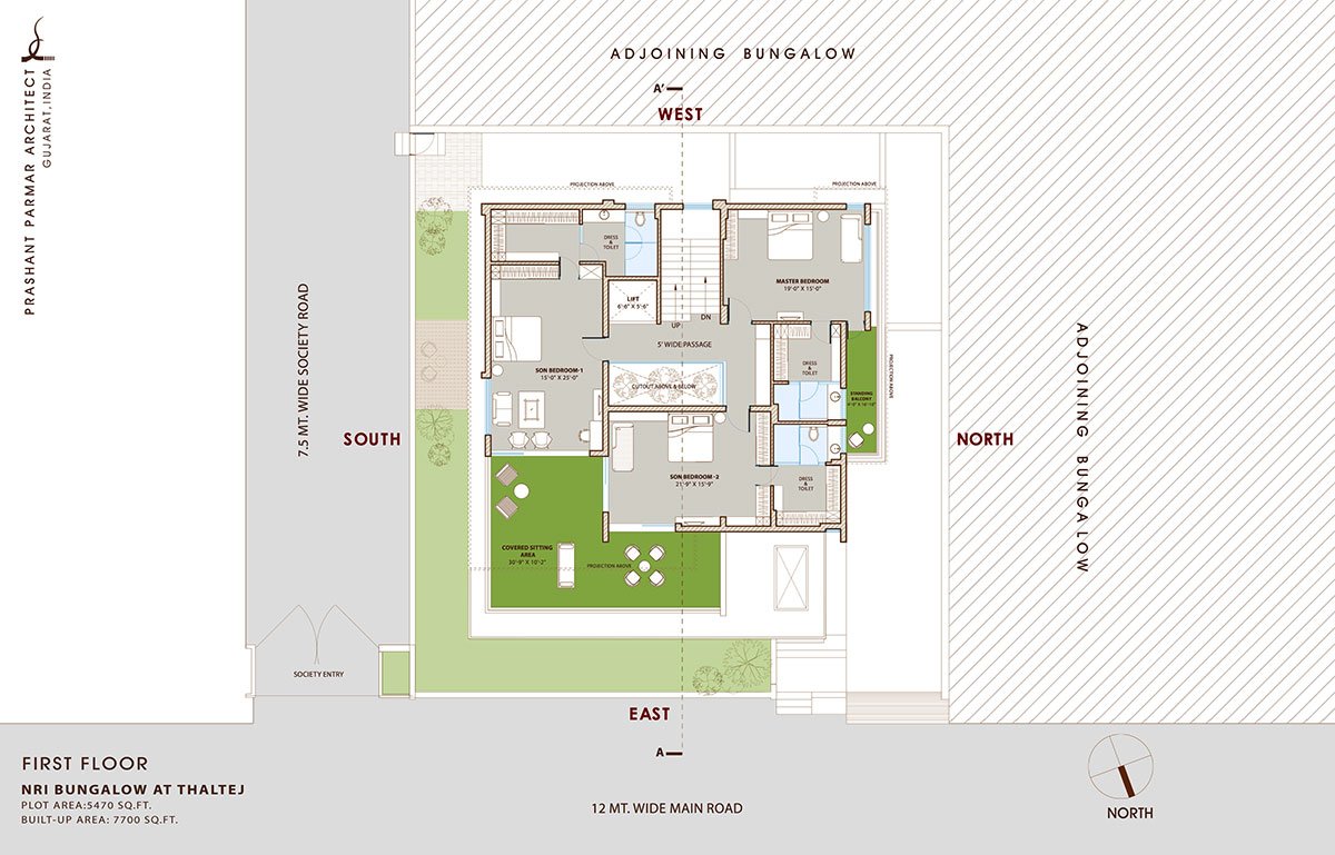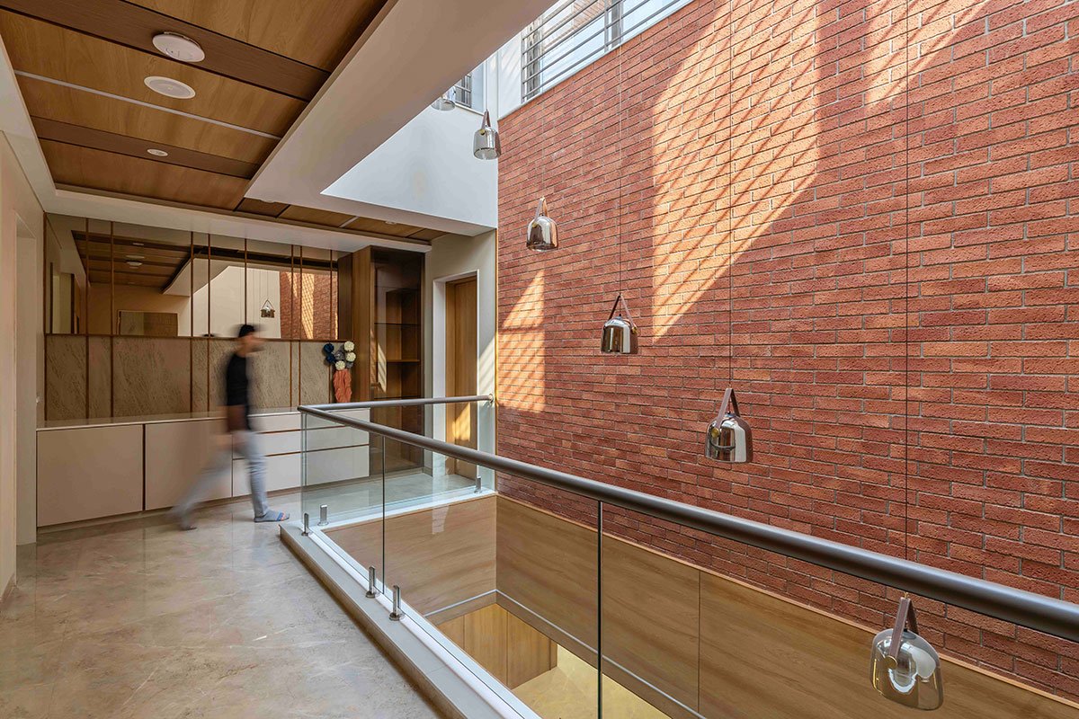 [Text as submitted by architect] Located in the prestigious Thaltej neighborhood of Ahmedabad, this 7700 sq ft bungalow blends modern design with timeless elegance, created for an NRI client. The bungalow sits on a 5470 sq ft East-facing plot and is designed to foster a seamless connection to nature while maintaining a luxurious and functional living environment. Privacy was a primary consideration, especially due to the adjacent bungalow and dual road access. To address this, the central courtyard serves as both a social centerpiece and a natural ventilation system, ensuring open, airy spaces throughout the home.