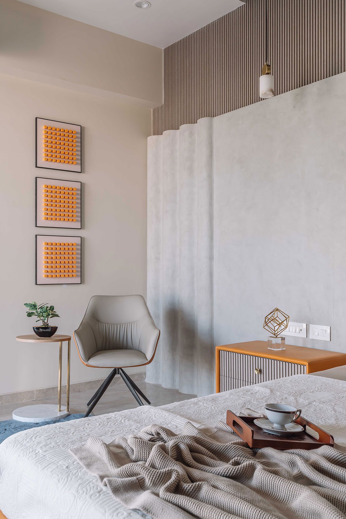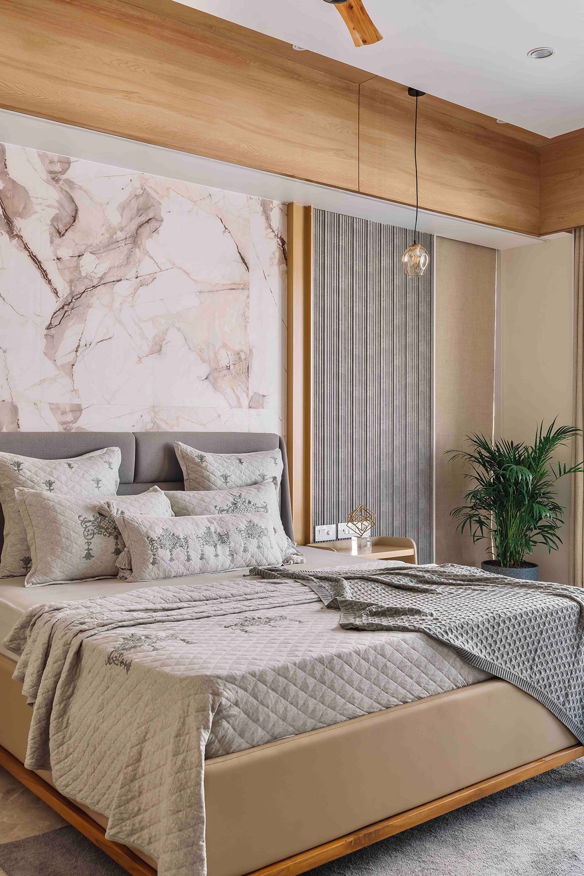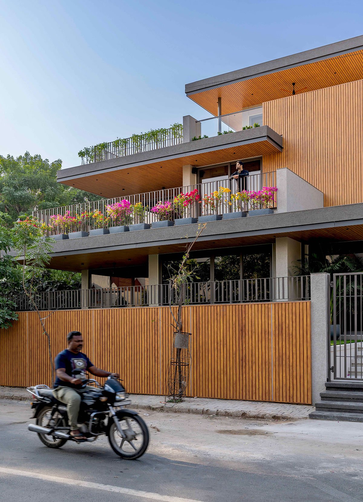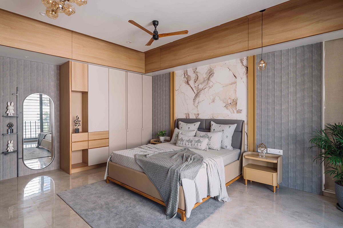 The exterior design embraces minimalist modernism, using earthy materials like vertical wood-textured metal cladding and grey stonecrete textured concrete, creating a sophisticated and harmonious aesthetic. Expansive balconies with lush greenery enhance the indoor-outdoor connection, while clean lines and strategically placed lighting highlight the architectural form. Positioned on a corner plot, the bungalow’s design makes it stand out while still blending harmoniously into its surroundings.
