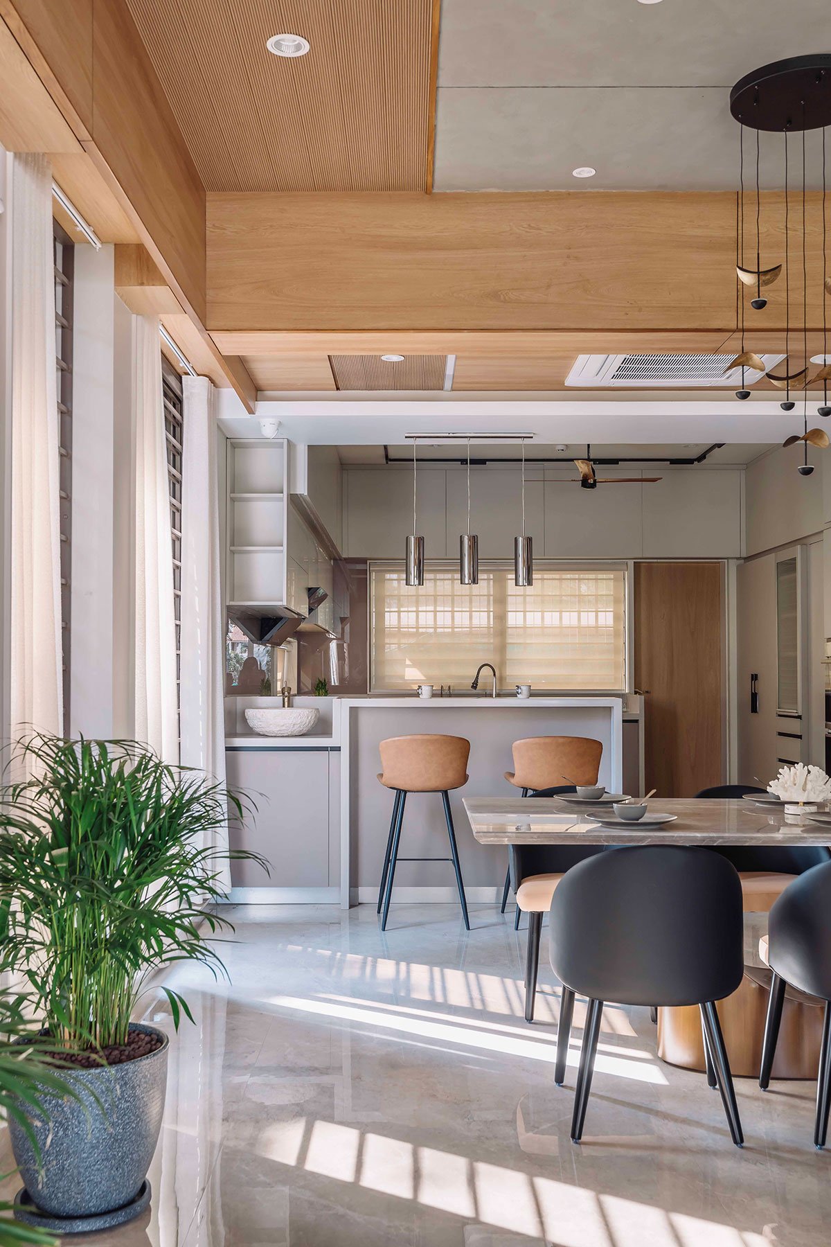 The drawing room, designed for formal gatherings, features a mix of neutral tones and luxurious materials. Large windows overlook the garden, flooding the room with natural light. A glass partition separates the drawing room from the family area, maintaining an open, airy atmosphere. The family room, with a minimalist cement-textured ceiling and wooden stripes, connects seamlessly to the dining area and kitchen, which are designed with an open-plan layout that enhances the home’s flow.